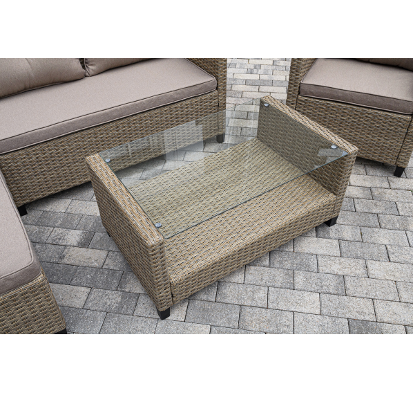 Журнальный столик выполнен из стали, вручную оплетенного круглым искусственным ротангом. Столешница из закаленного стекла.