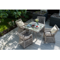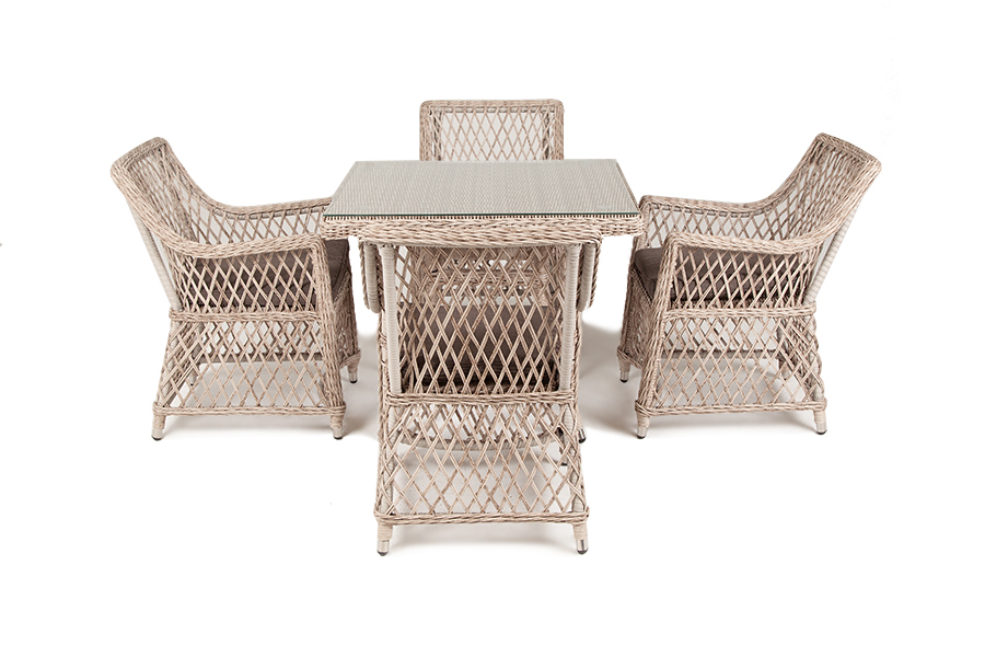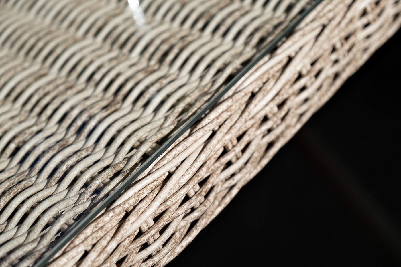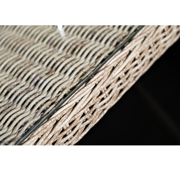 Каркас мебели выполнен из прочного и легкого алюминия, оплетенного вручную искусственным ротангом бежевого цвета, столешница – закаленное стекло.