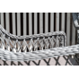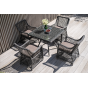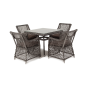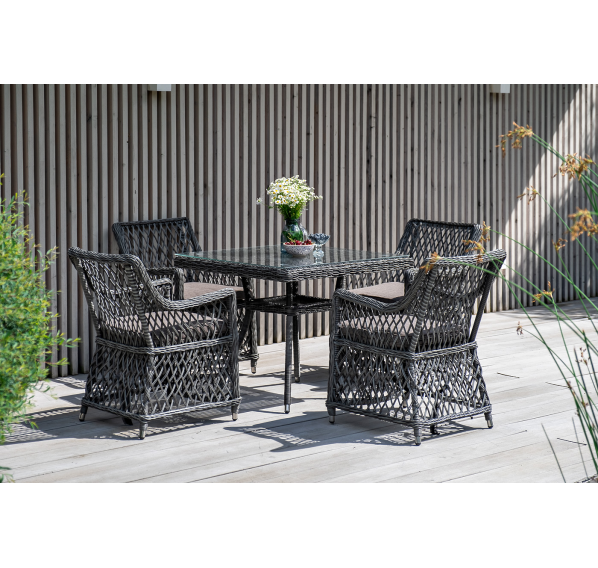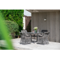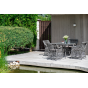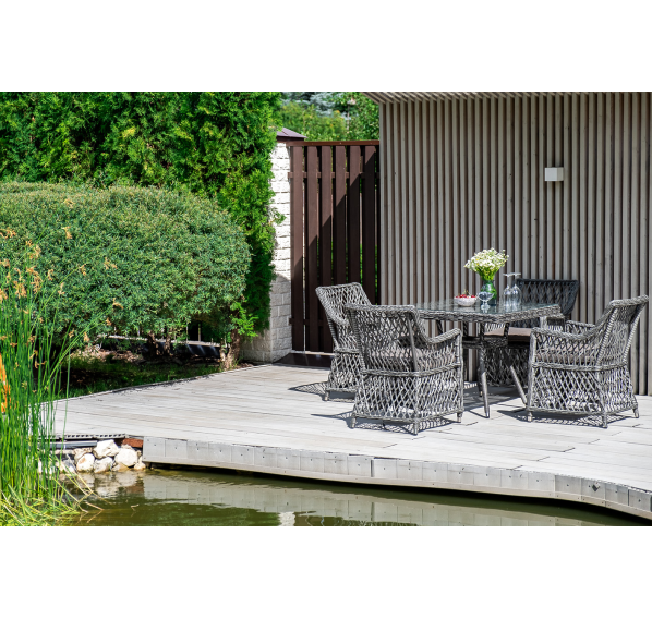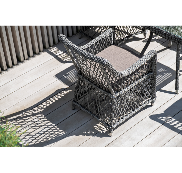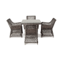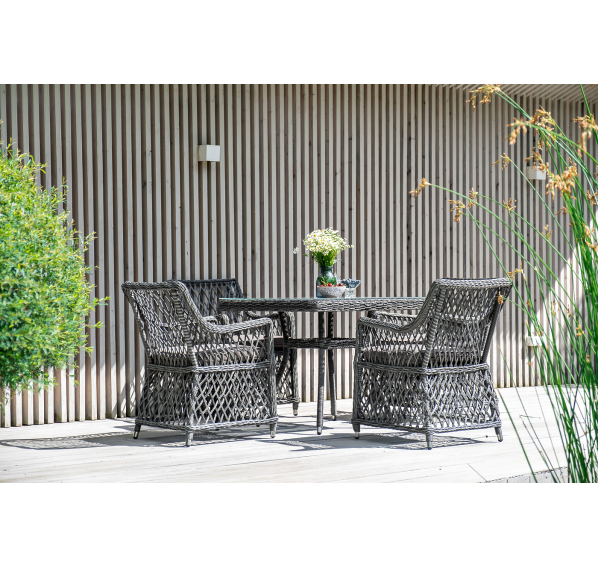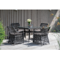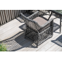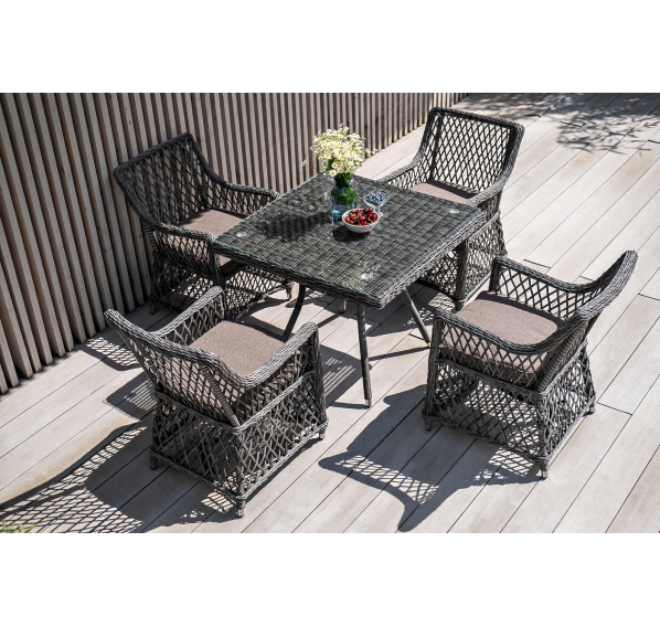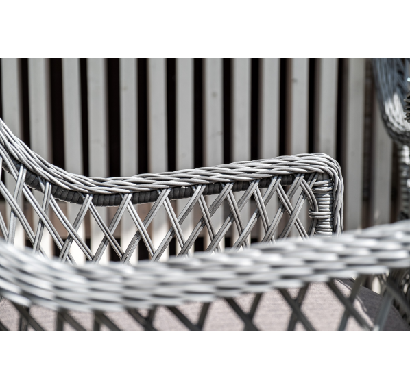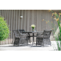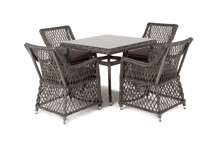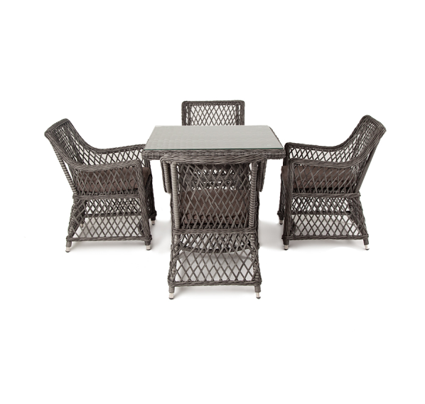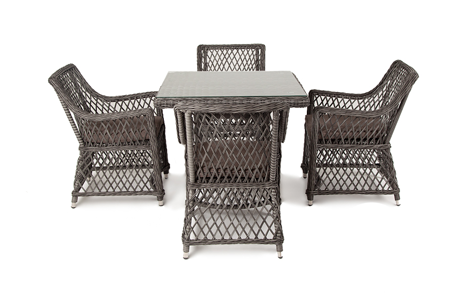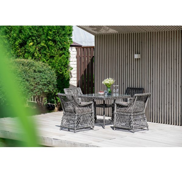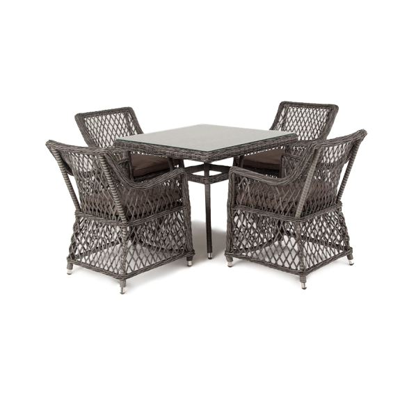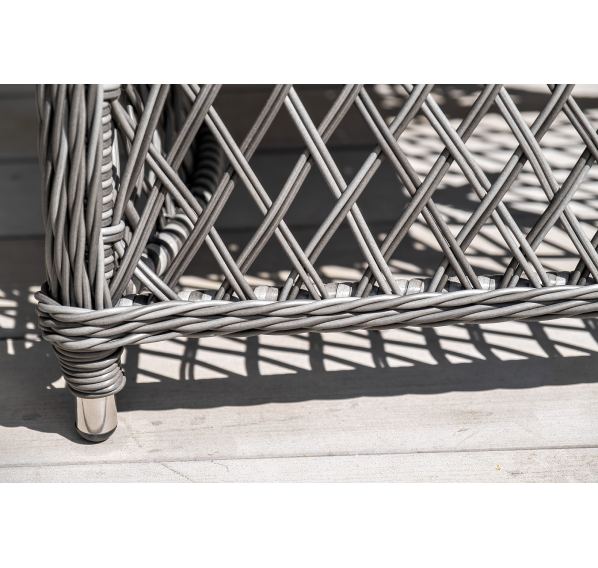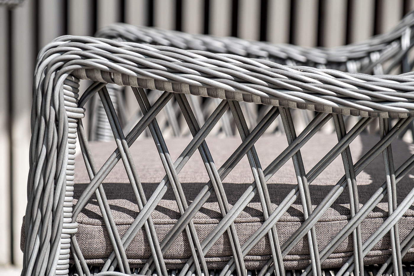 Каркас мебели выполнен из прочного и легкого алюминия, оплетенного вручную долговечным искусственным ротангом графитового цвета, столешница – закаленное стекло.