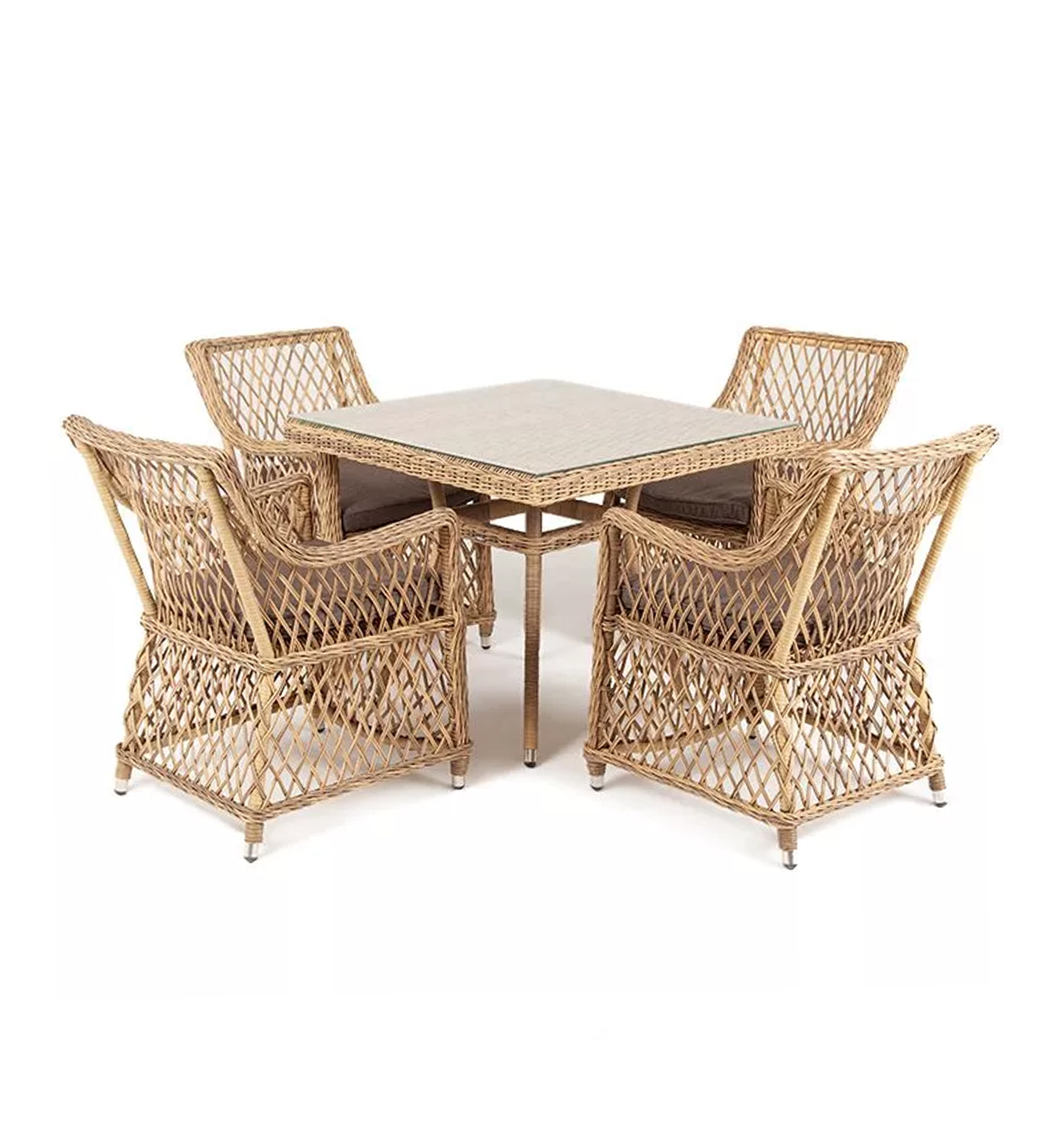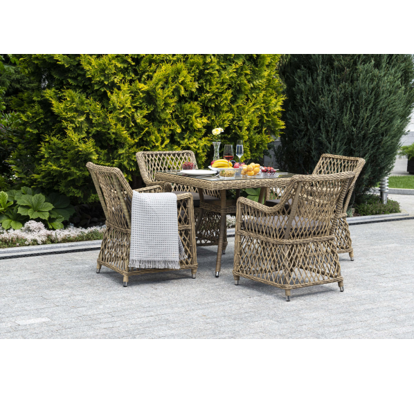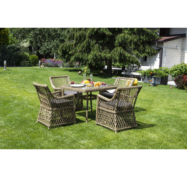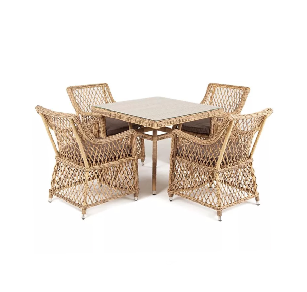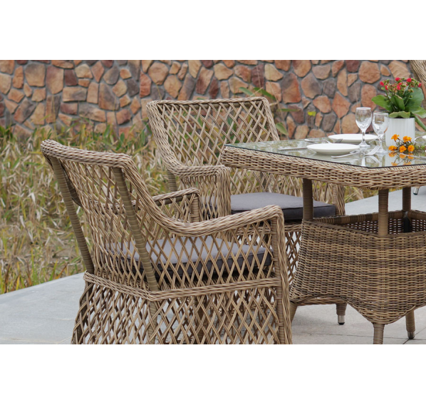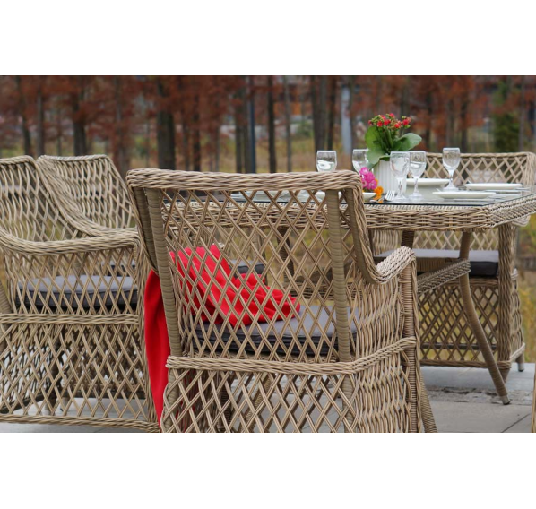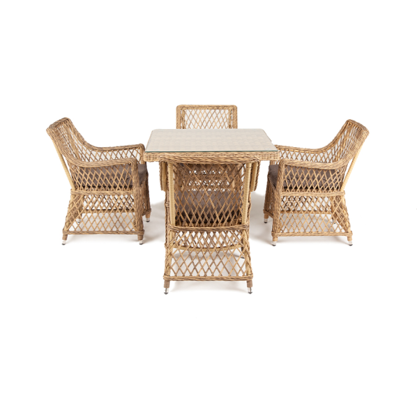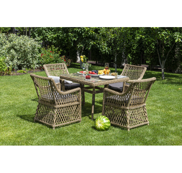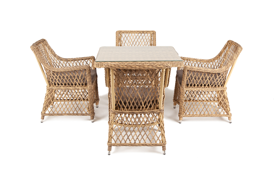 Каркас мебели выполнен из прочного и легкого алюминия, оплетенного вручную долговечным искусственным ротангом натурального соломенного цвета, столешница – прочное стекло.