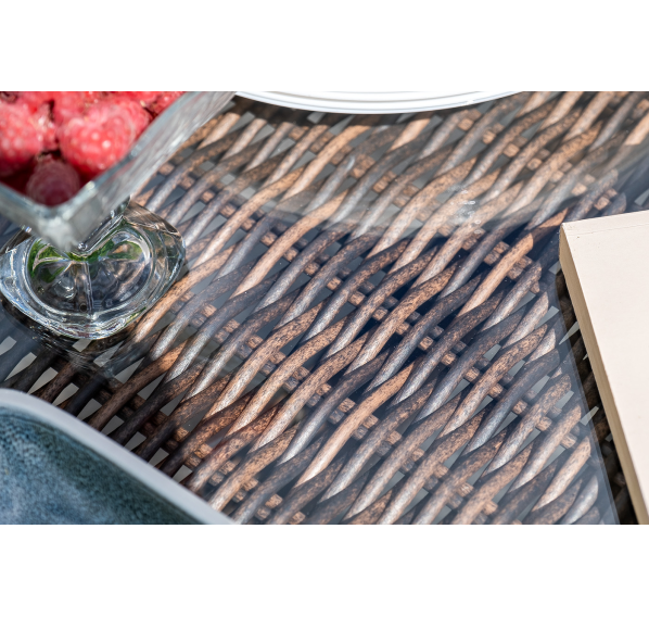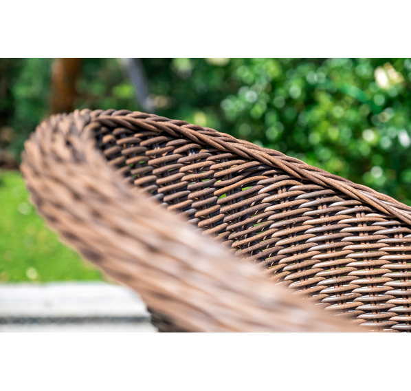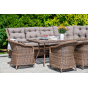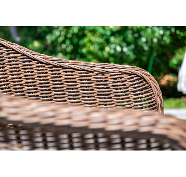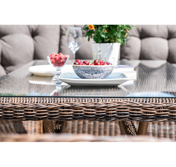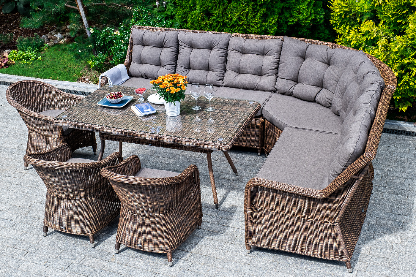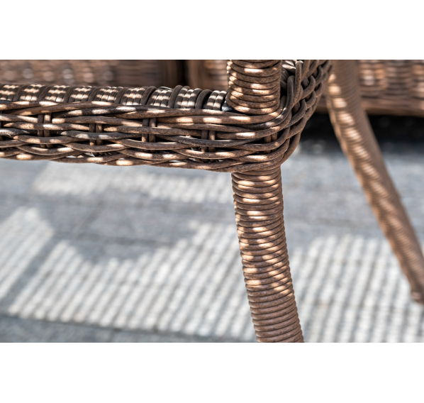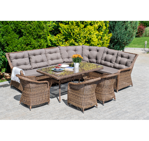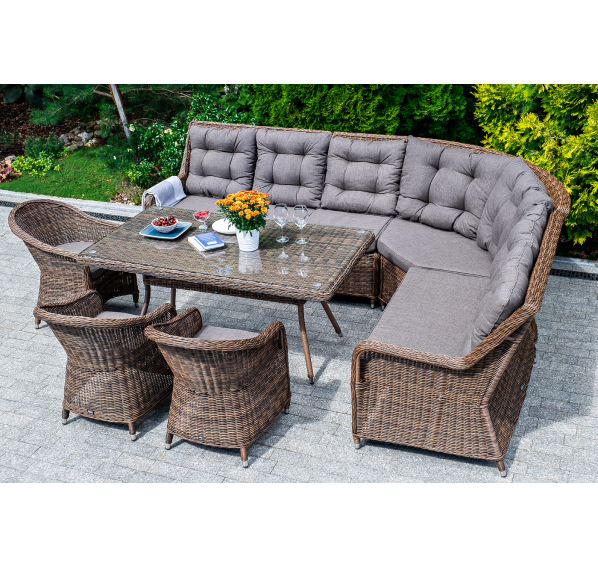 Угловая модульная лаунж-зона с обеденным столом и тремя стульями. Искусственный ротанг, плетение круглое, цвет коричневый, алюминиевый каркас. Столешница из закаленого стекла 5 мм.