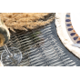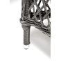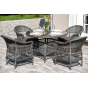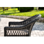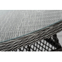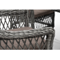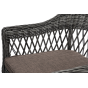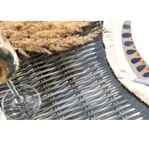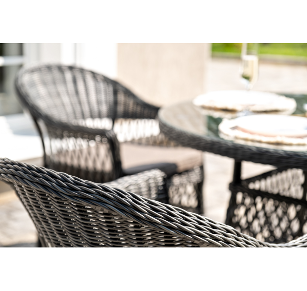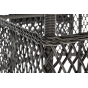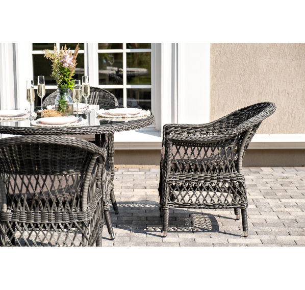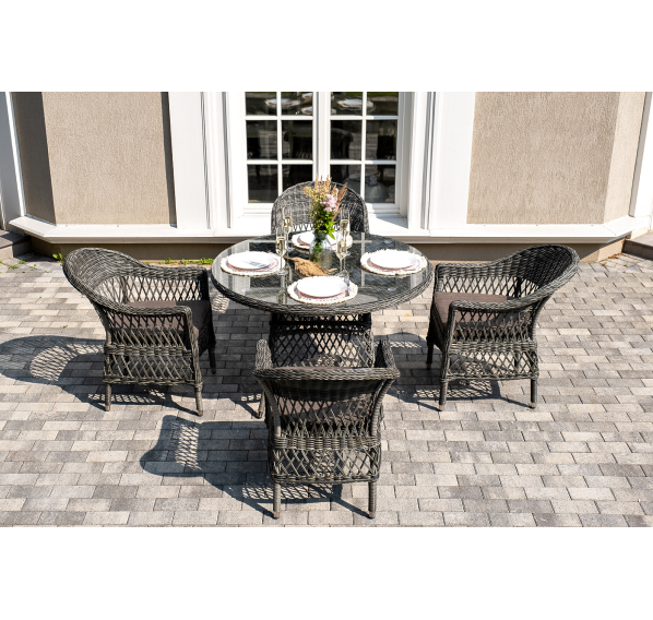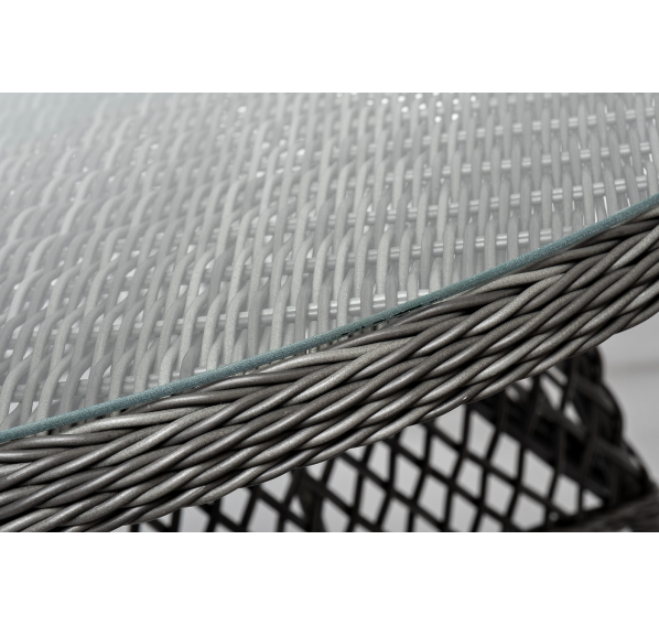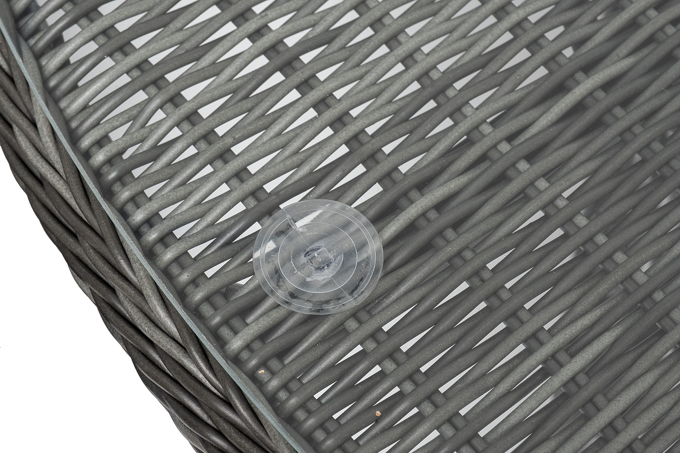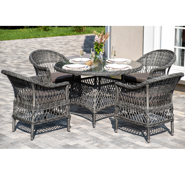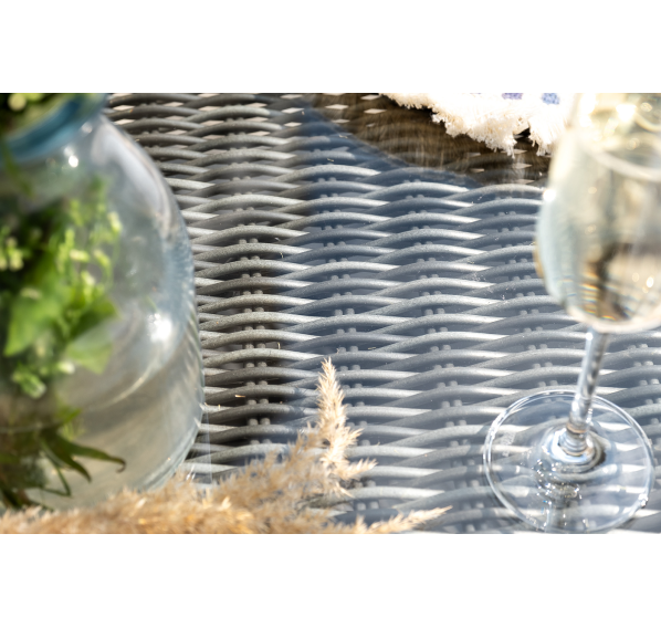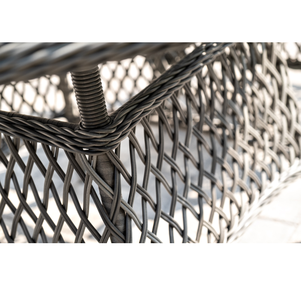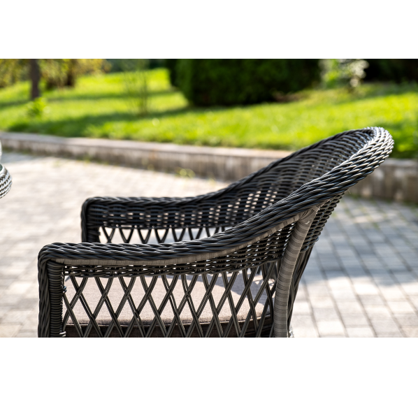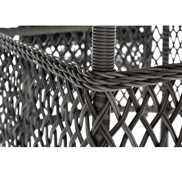 Вся мебель изготовлена из алюминия, поэтому ее очень легко перемещать. Декоративное покрытие выполнено из долговечного искусственного ротанга, устойчивого к перепадам температур и переменам погоды. Столешница изготовлена из прочного закаленного стекла 5 мм, кресла укомплектованы подушками серого цвета со съёмными чехлами.