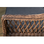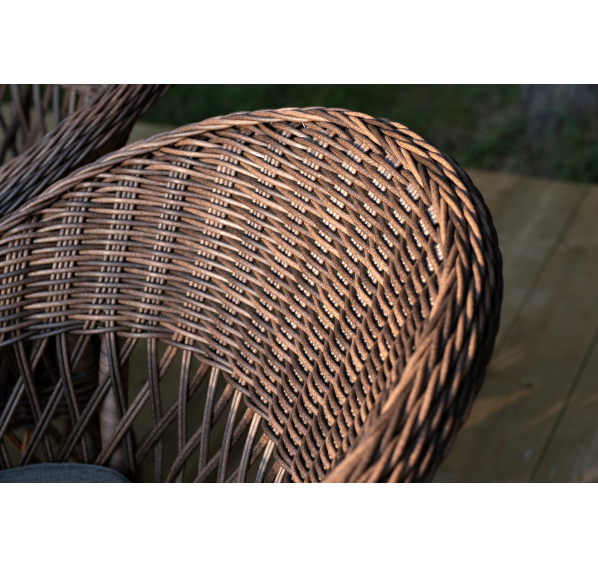 Из алюминия выполнен устойчивый каркас мебели, который задекорирован искусственным ротангом круглого ручного плетения. Комплект представлен в коричневом цвете.