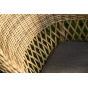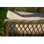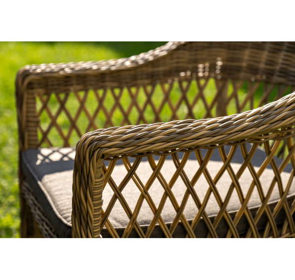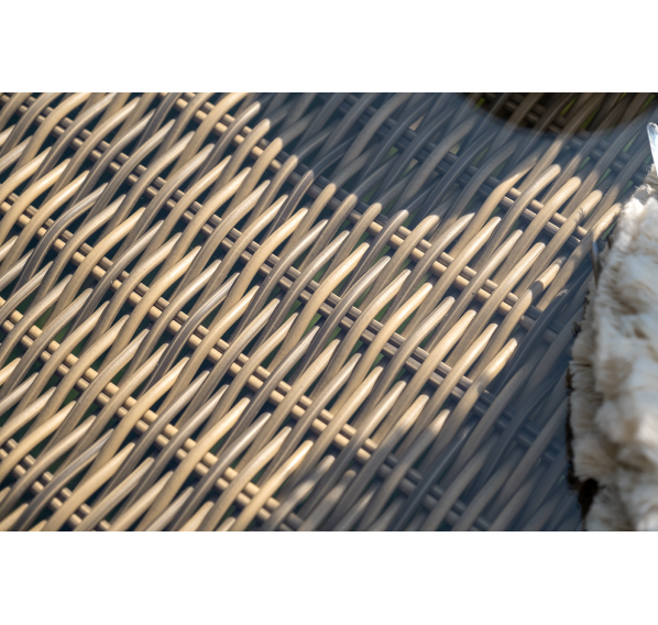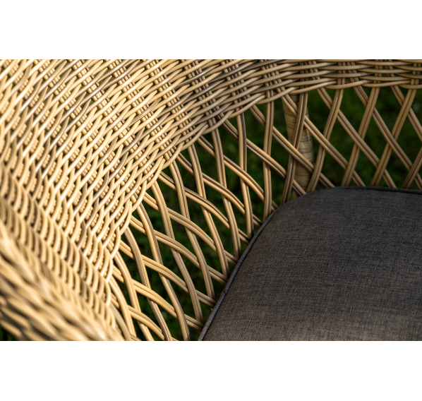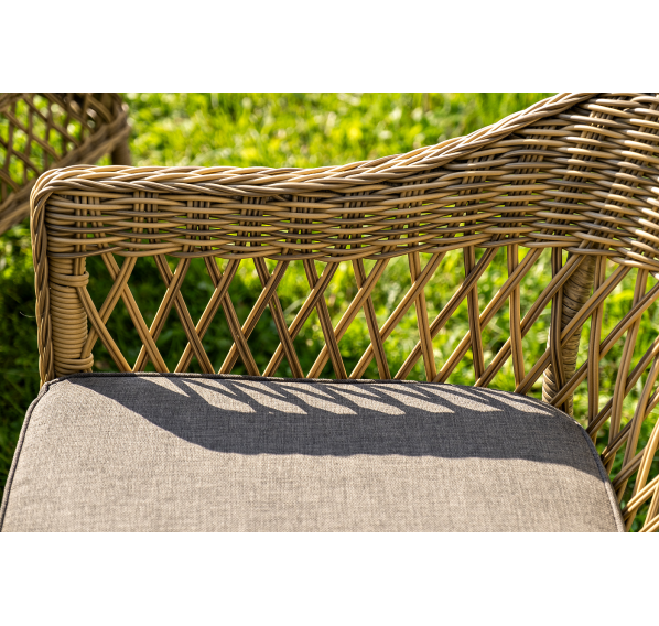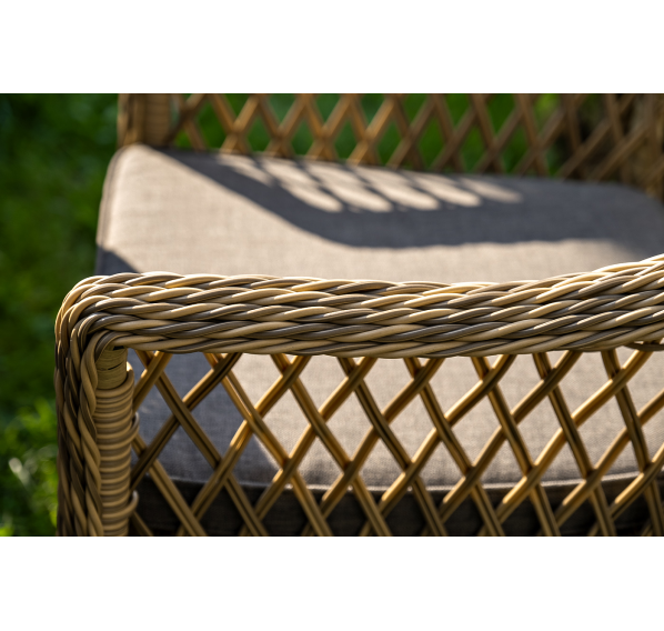 Из алюминия выполнен устойчивый каркас мебели, который задекорирован искусственным ротангом круглого ручного плетения. Комплект представлен в соломенном цвете.