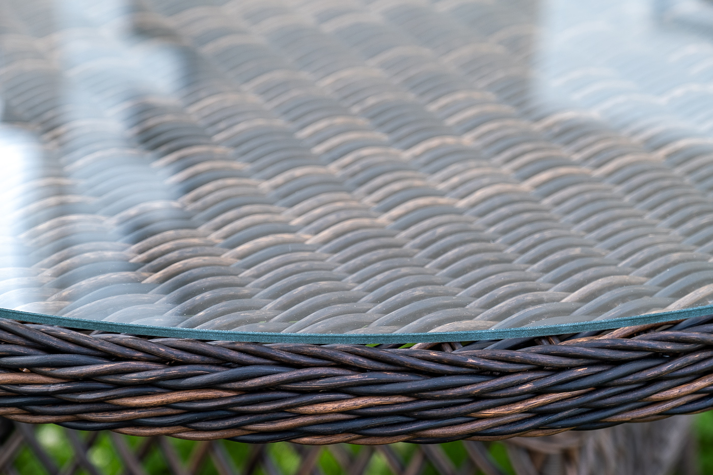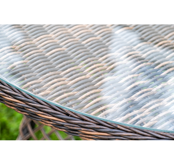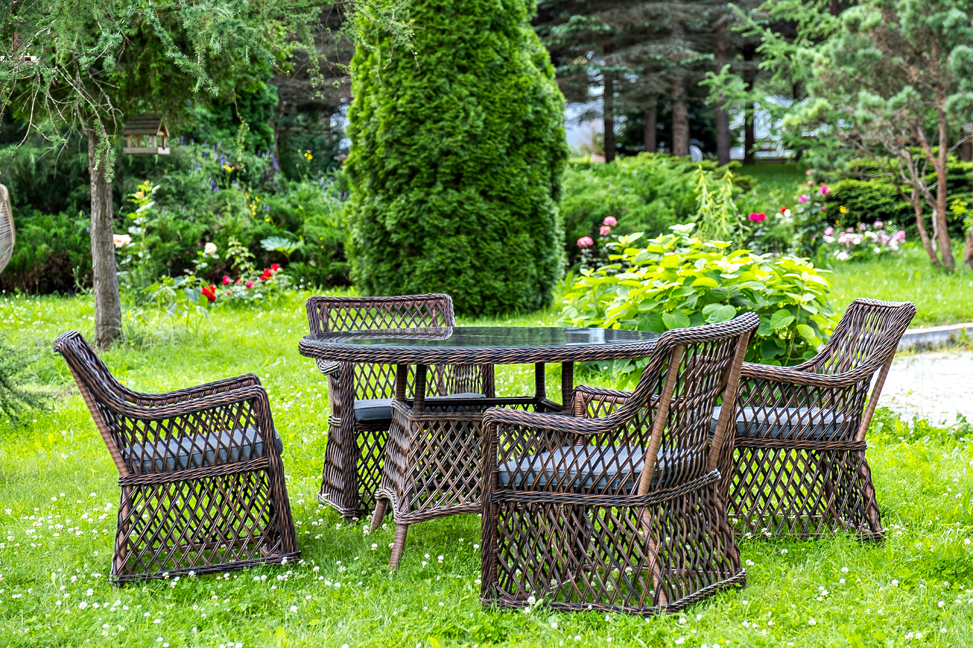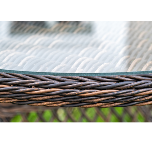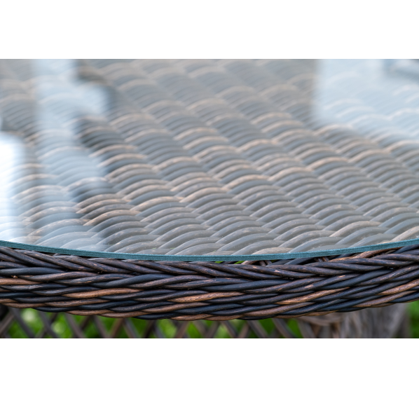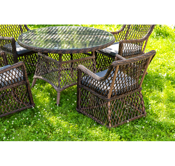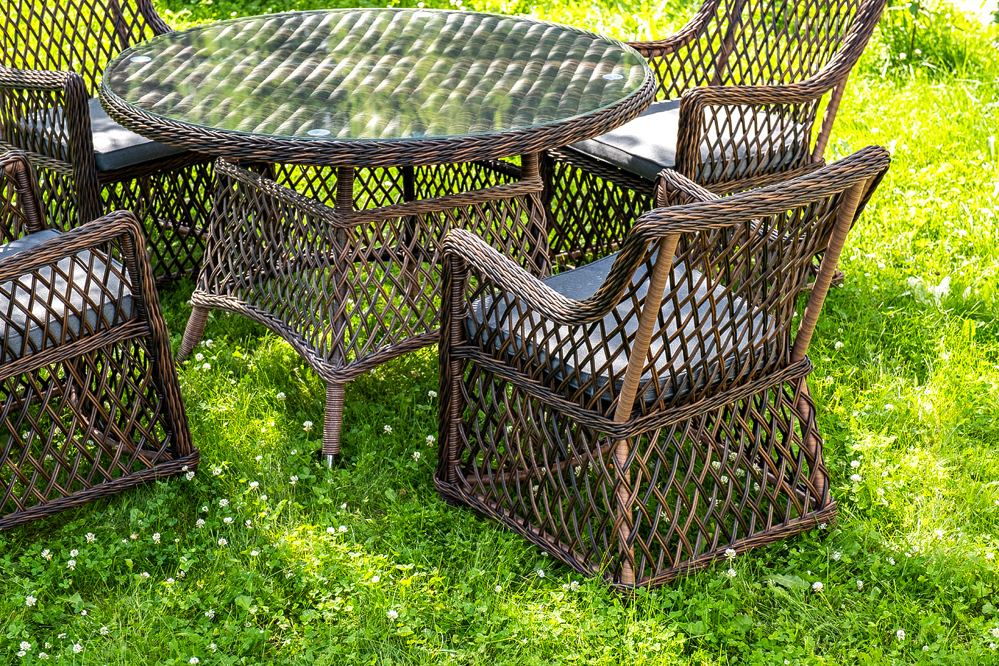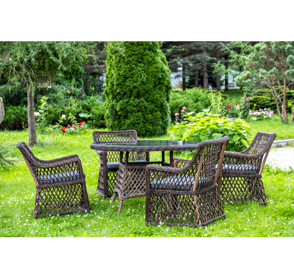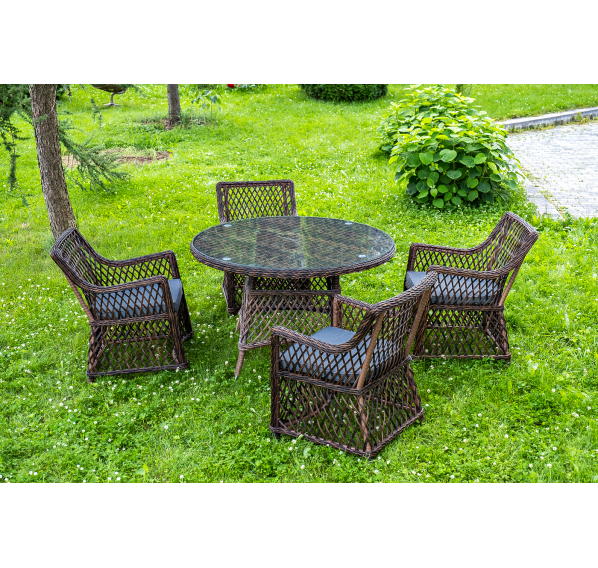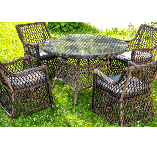 Классическая уличная обеденная группа «Доппио» для сада, летней веранды ресторана. В комплекте круглый обеденный стол «Эспрессо» (1180×1180×750 мм) с ударопрочной стеклянной столешницей и 4 кресла коллекции «Латте» 550×660×850 мм.