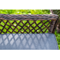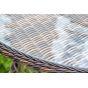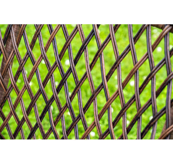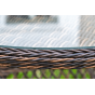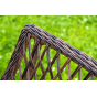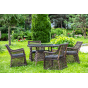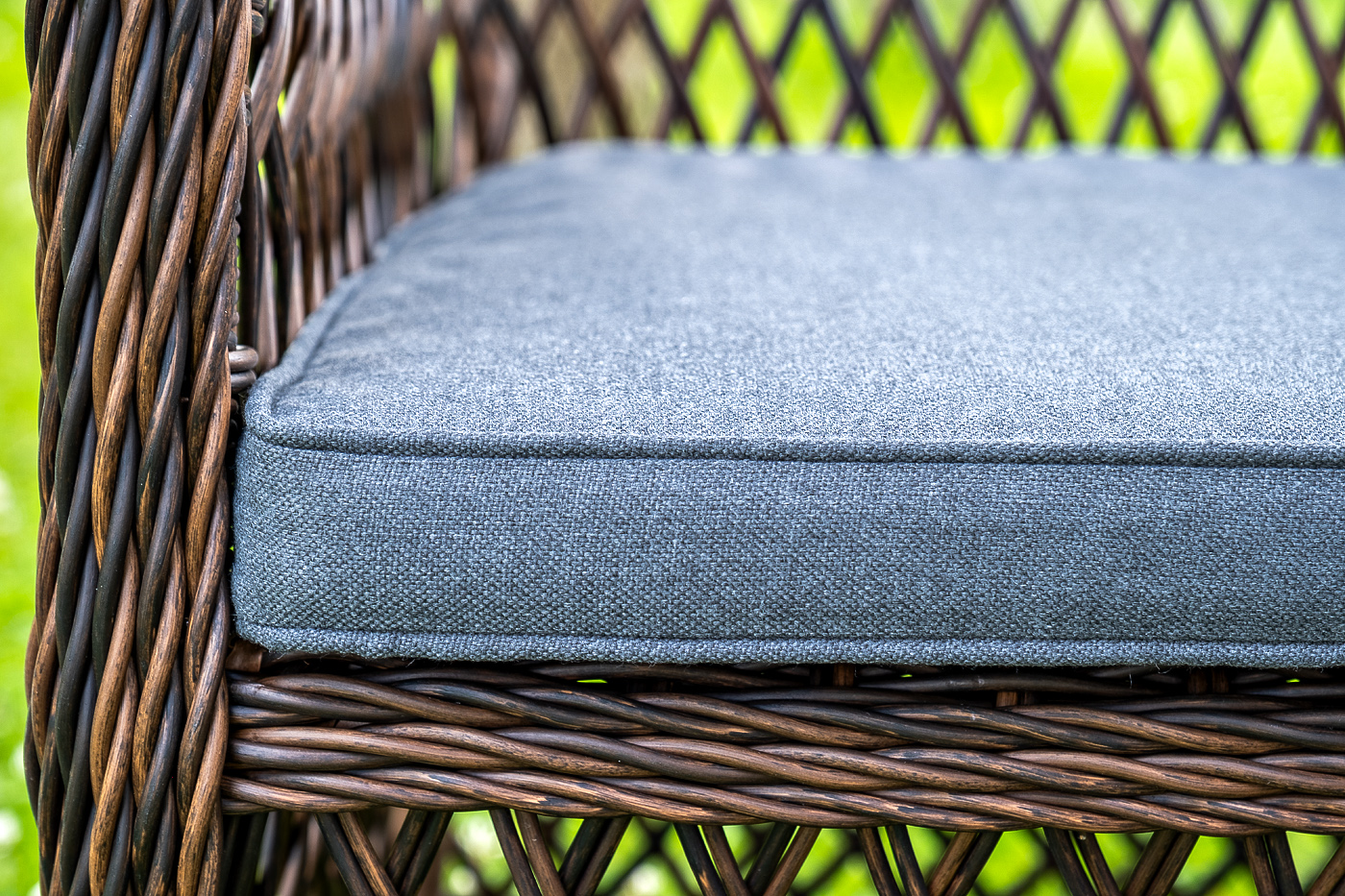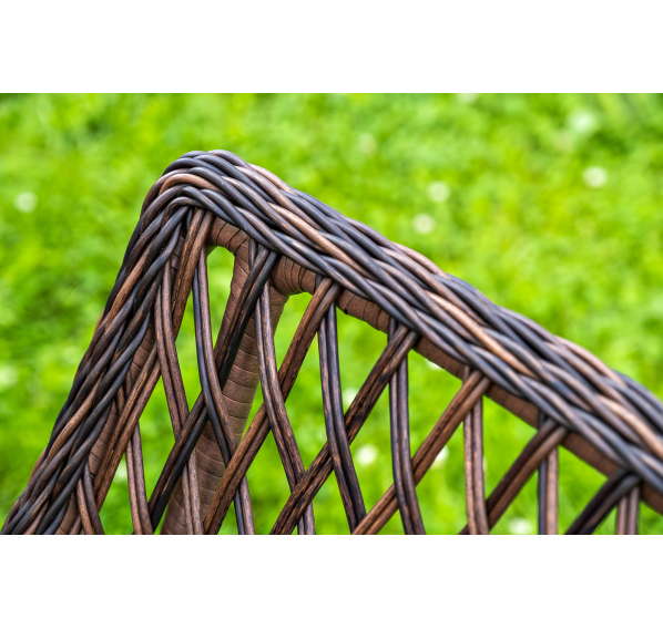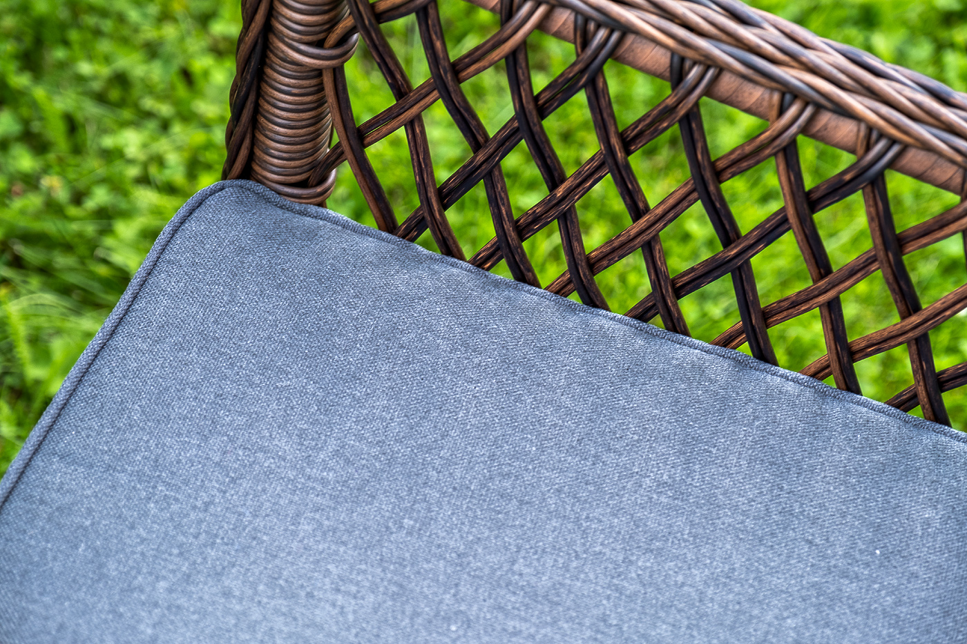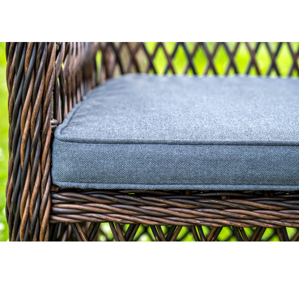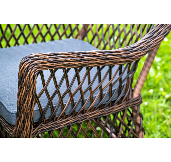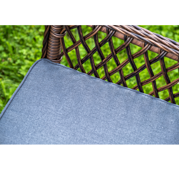 Каркас мебели выполнен из прочного и легкого алюминия, вручную оплетенного круглым синтетическим ротангом натурального коричневого оттенка. На креслах предусмотрены мягкие подушки со съёмными чехлами серого цвета.