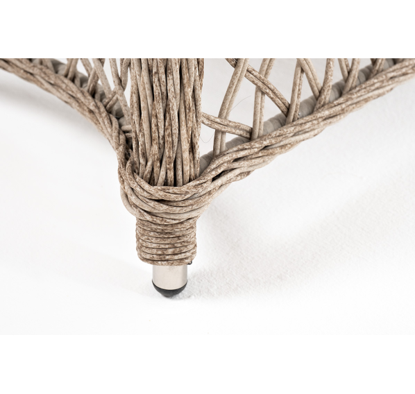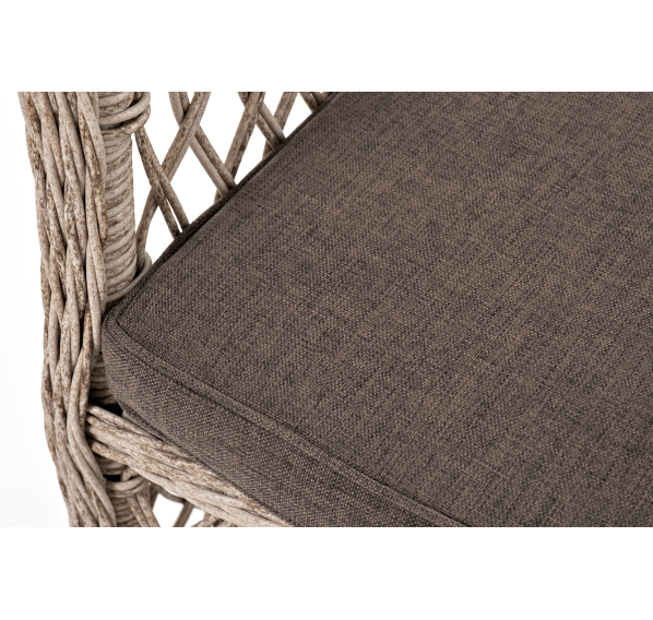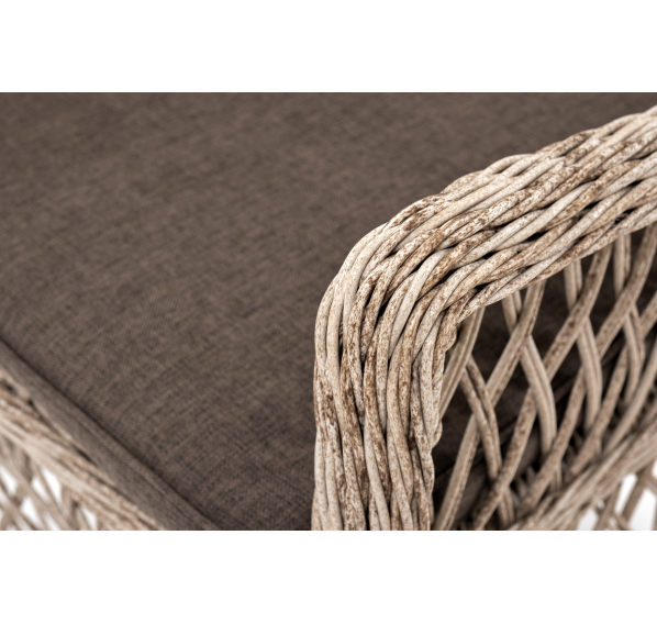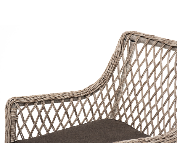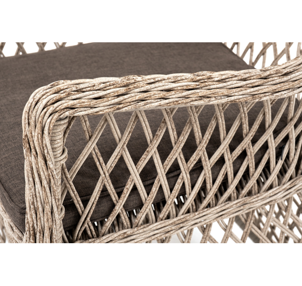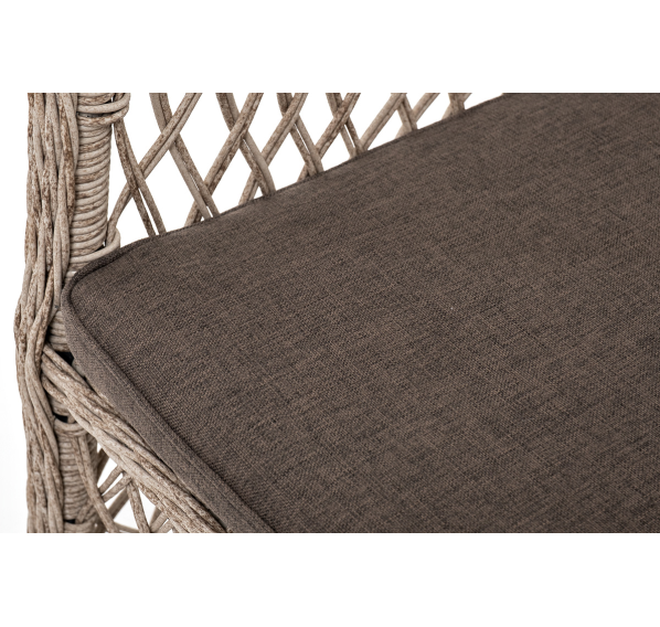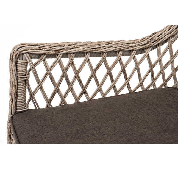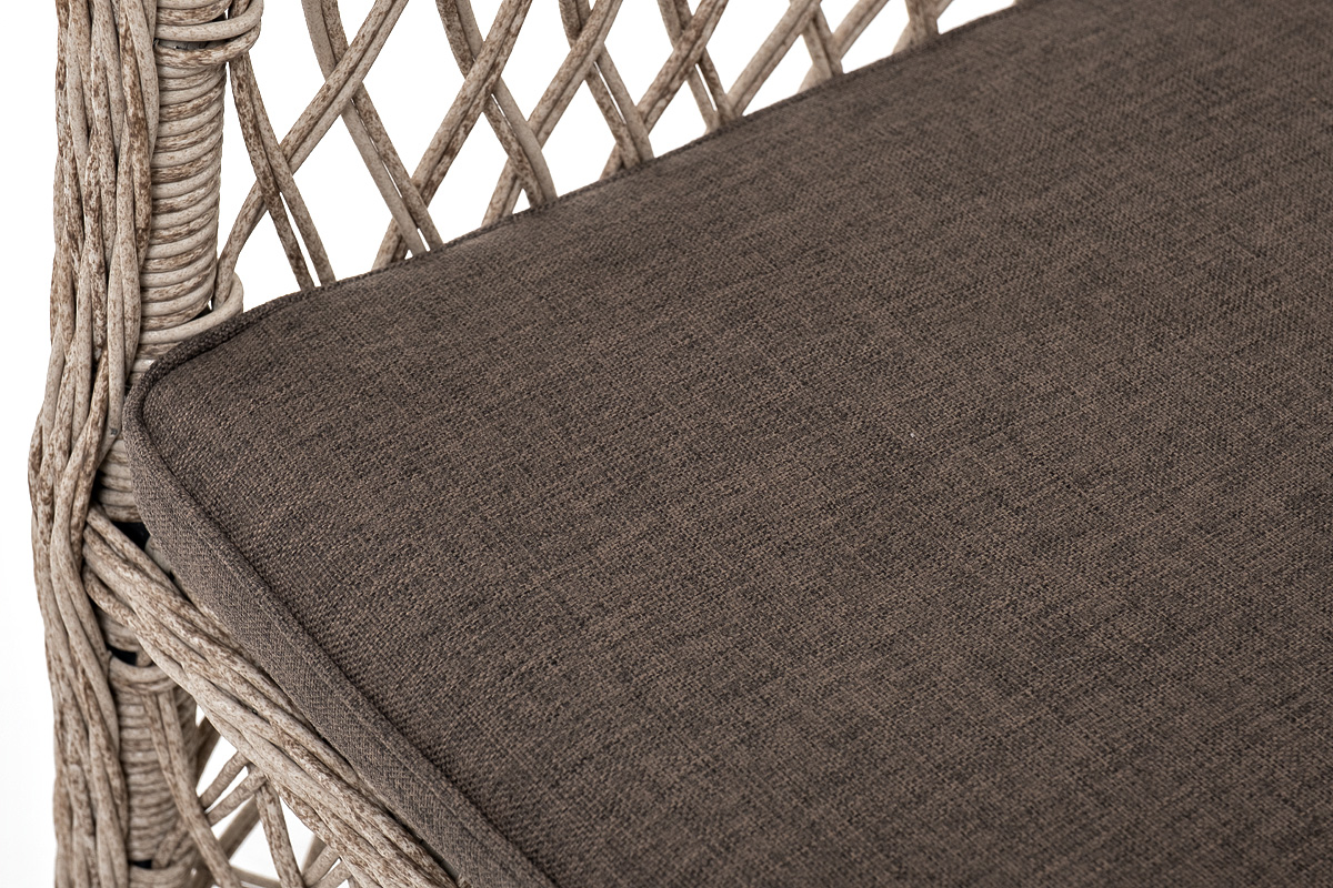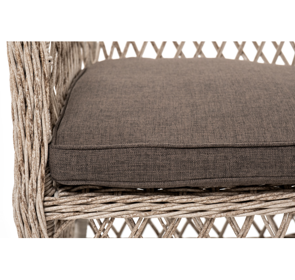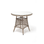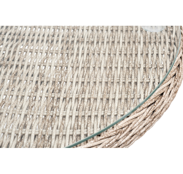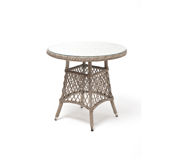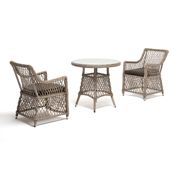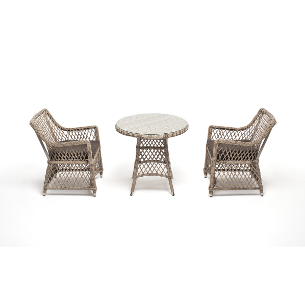 В плетеный комплект входит круглый стол «Эспрессо» диаметром 80 см с ударопрочной стеклянной столешницей и 2 кресла коллекции «Латте» 550×660×850 мм.