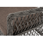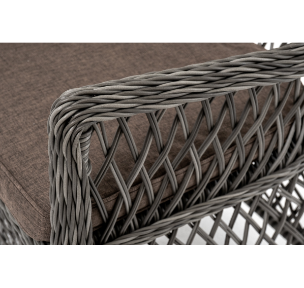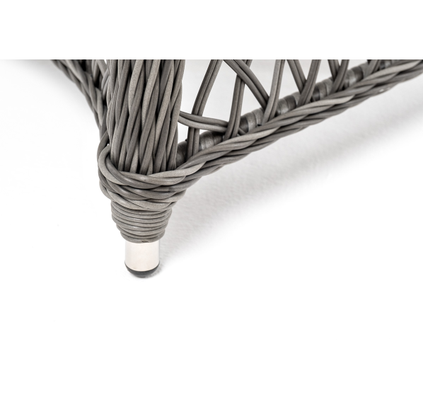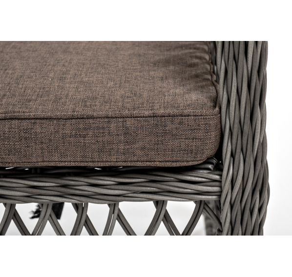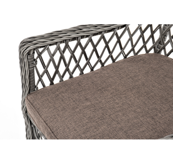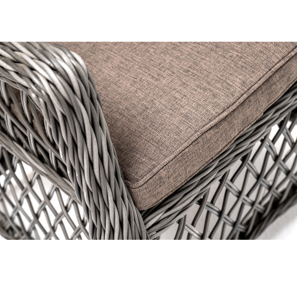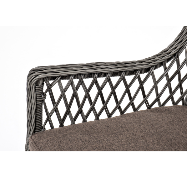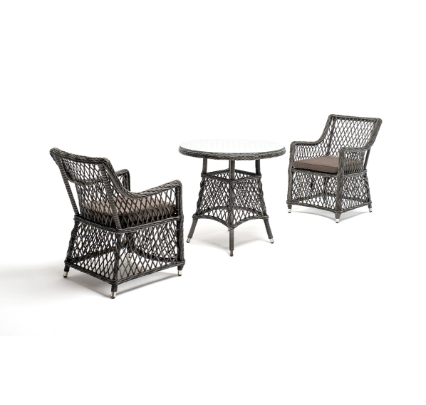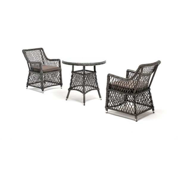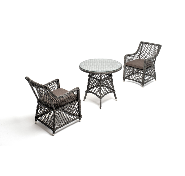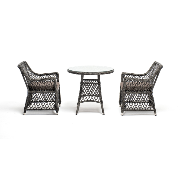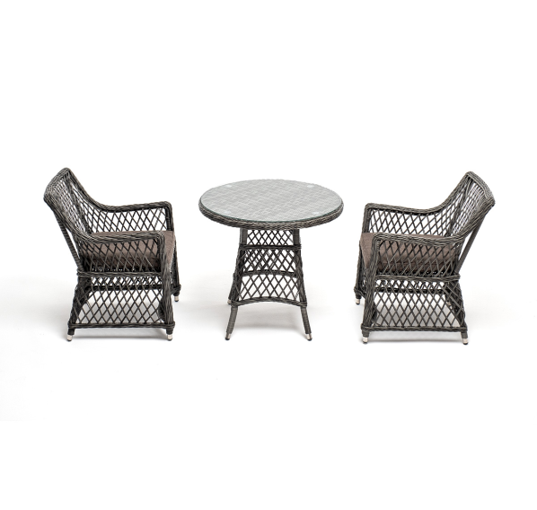 В плетеный комплект входит круглый стол «Эспрессо» диаметром 80 см с ударопрочной стеклянной столешницей и 2 кресла коллекции «Латте» 550×660×850 мм.