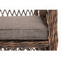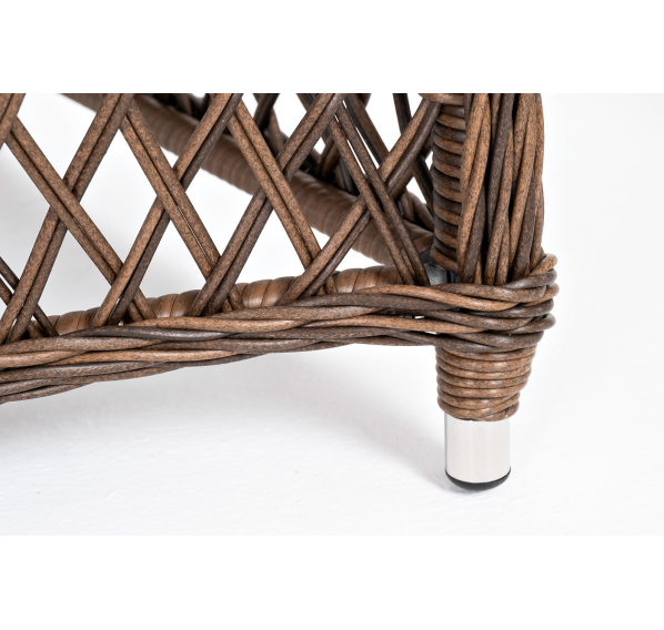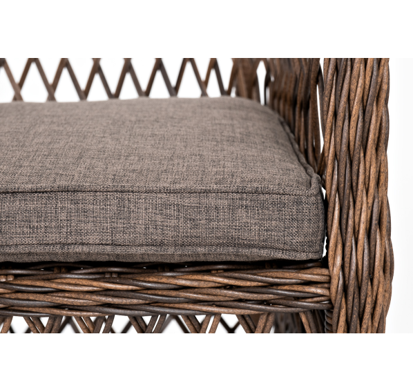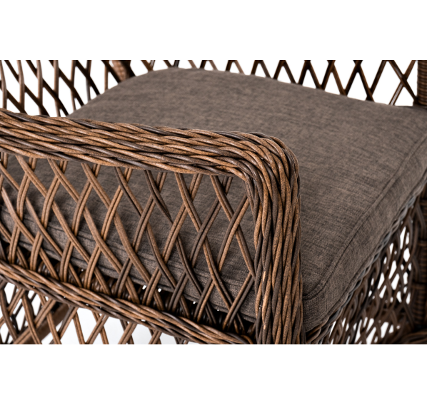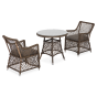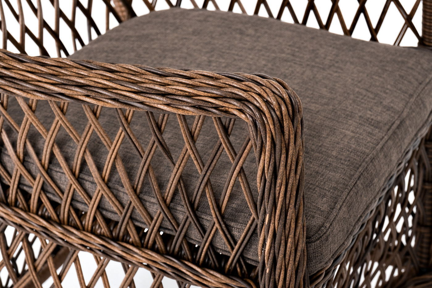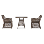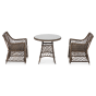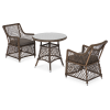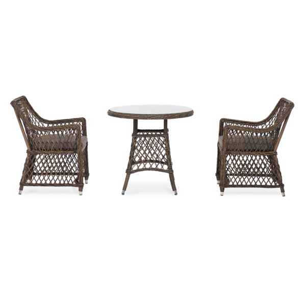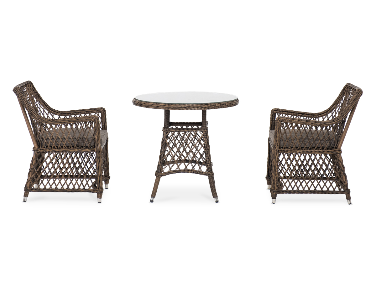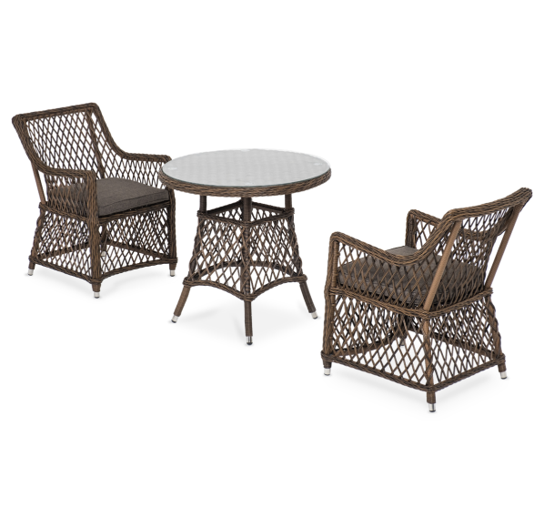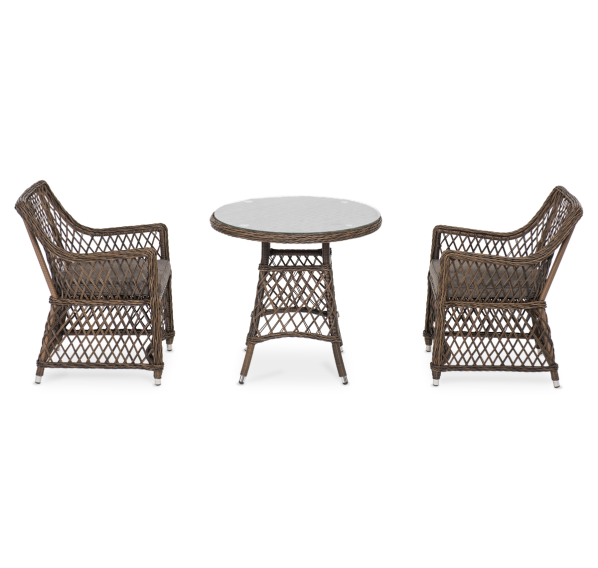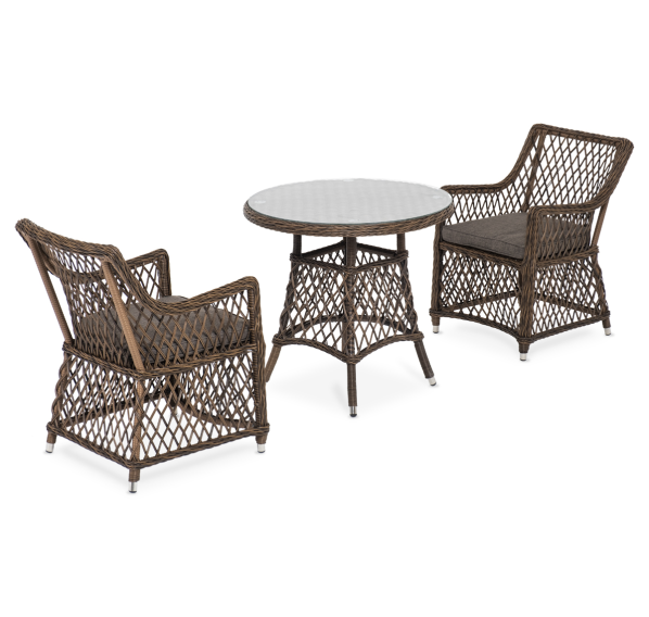 В плетеный комплект входит круглый стол «Эспрессо» диаметром 80 см с ударопрочной стеклянной столешницей и 2 кресла коллекции «Латте» 550×660×850 мм.