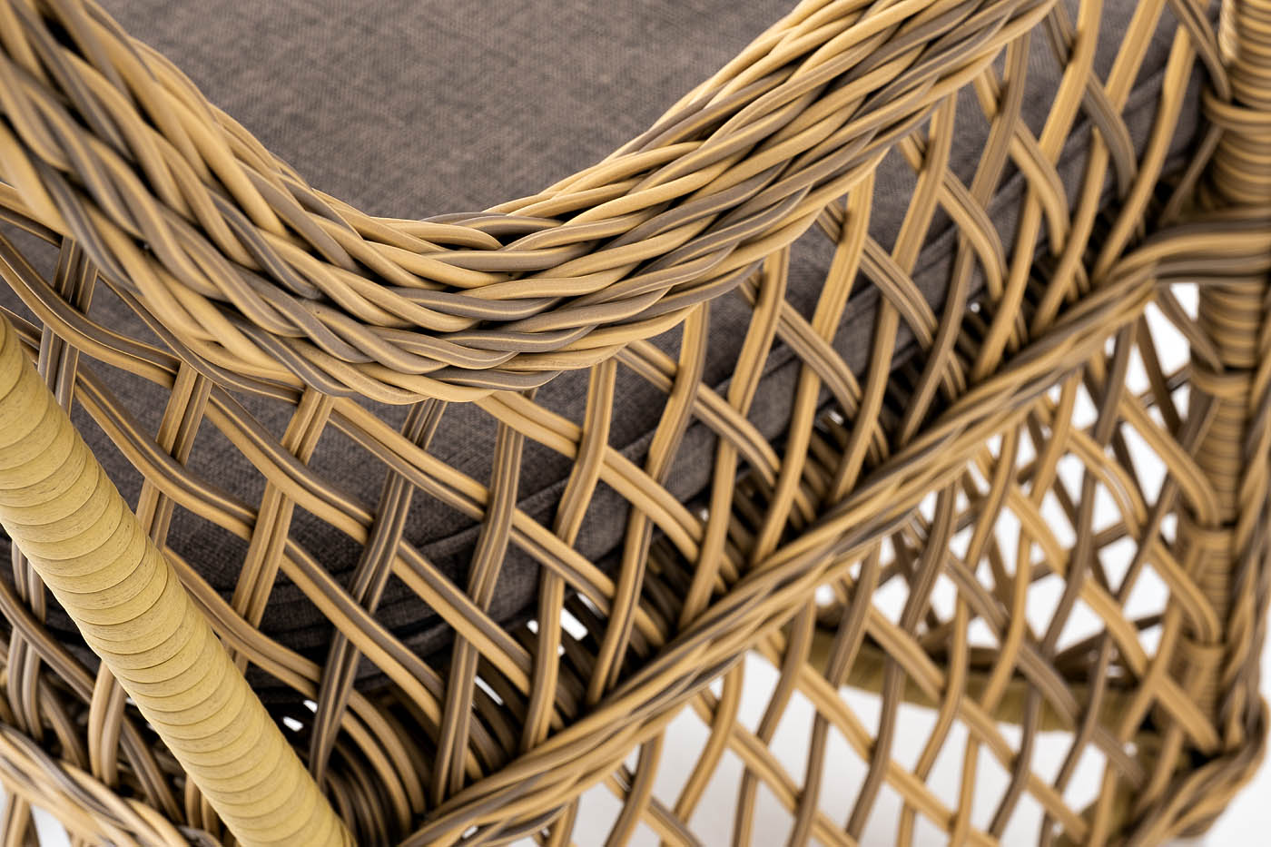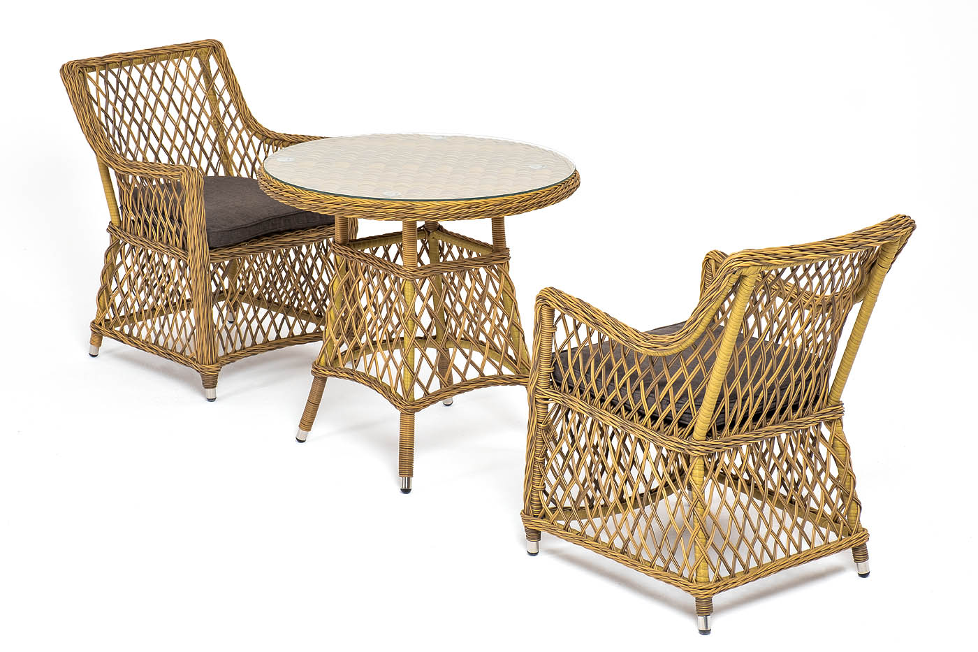 В плетеный комплект входит круглый стол «Эспрессо» диаметром 80 см с ударопрочной стеклянной столешницей и 2 кресла коллекции «Латте» 550×660×850 мм.