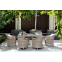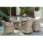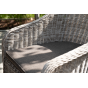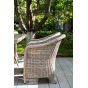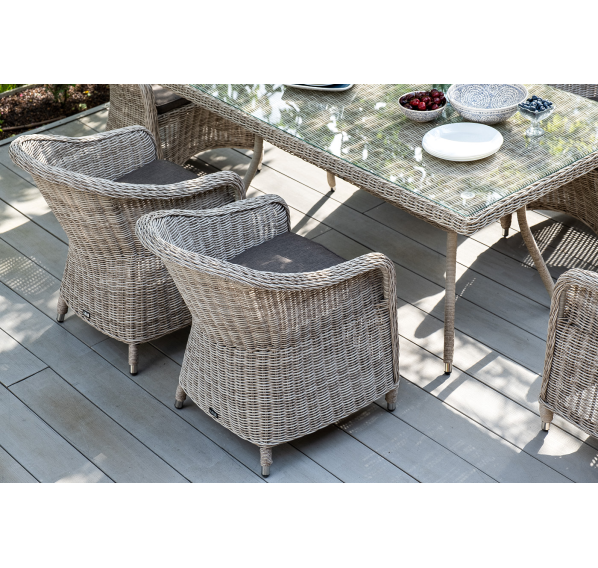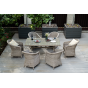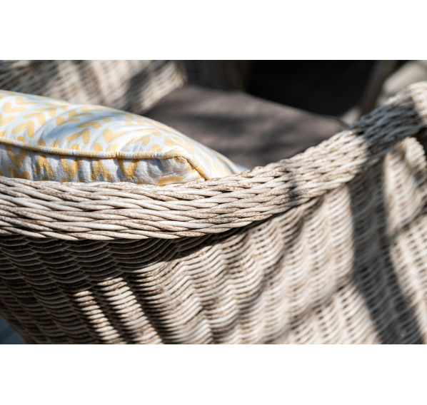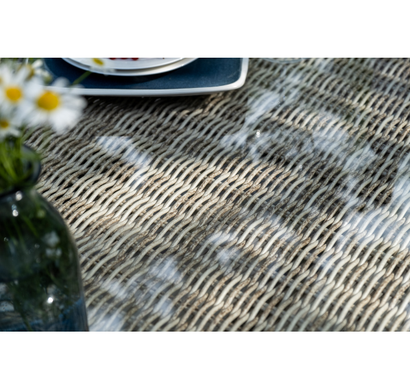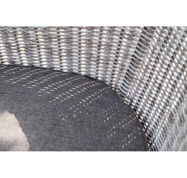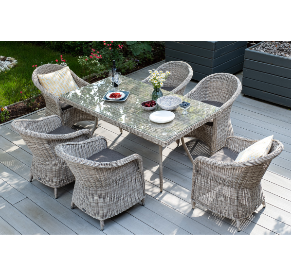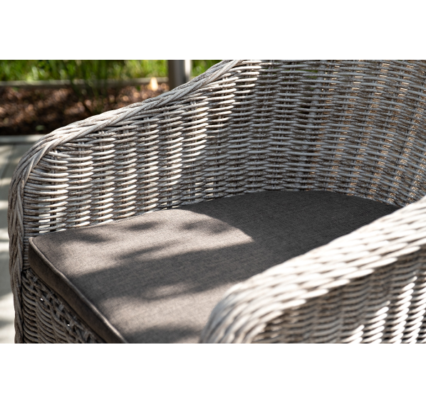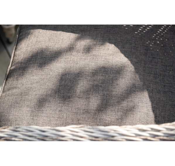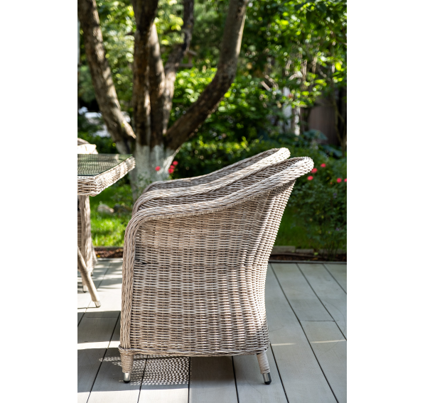 Каркас всех предметов мебели изготовлен из легкого и прочного алюминия, оплетенного вручную искусственным ротангом. Стол для удобства использования накрыт прочным стеклом, кресла укомплектованы подушками со съёмными чехлами серого цвета.