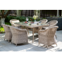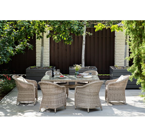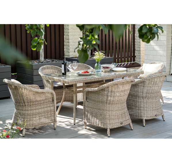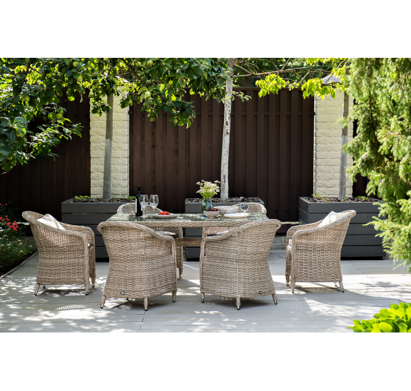 Премиальная обеденная группа «Эспрессо» для большой компании. В набор входит большой прямоугольный стол «Латте», размером - 1600×900×750 мм и 6 кресел «Равенна», размер - 570×680×810 мм, в бежевом оттенке.