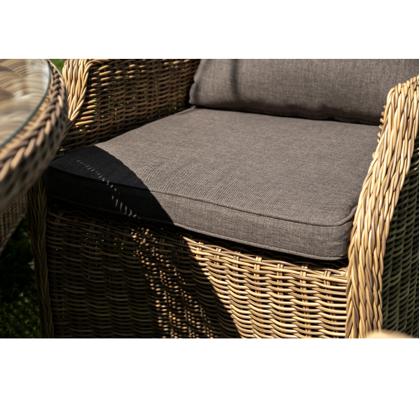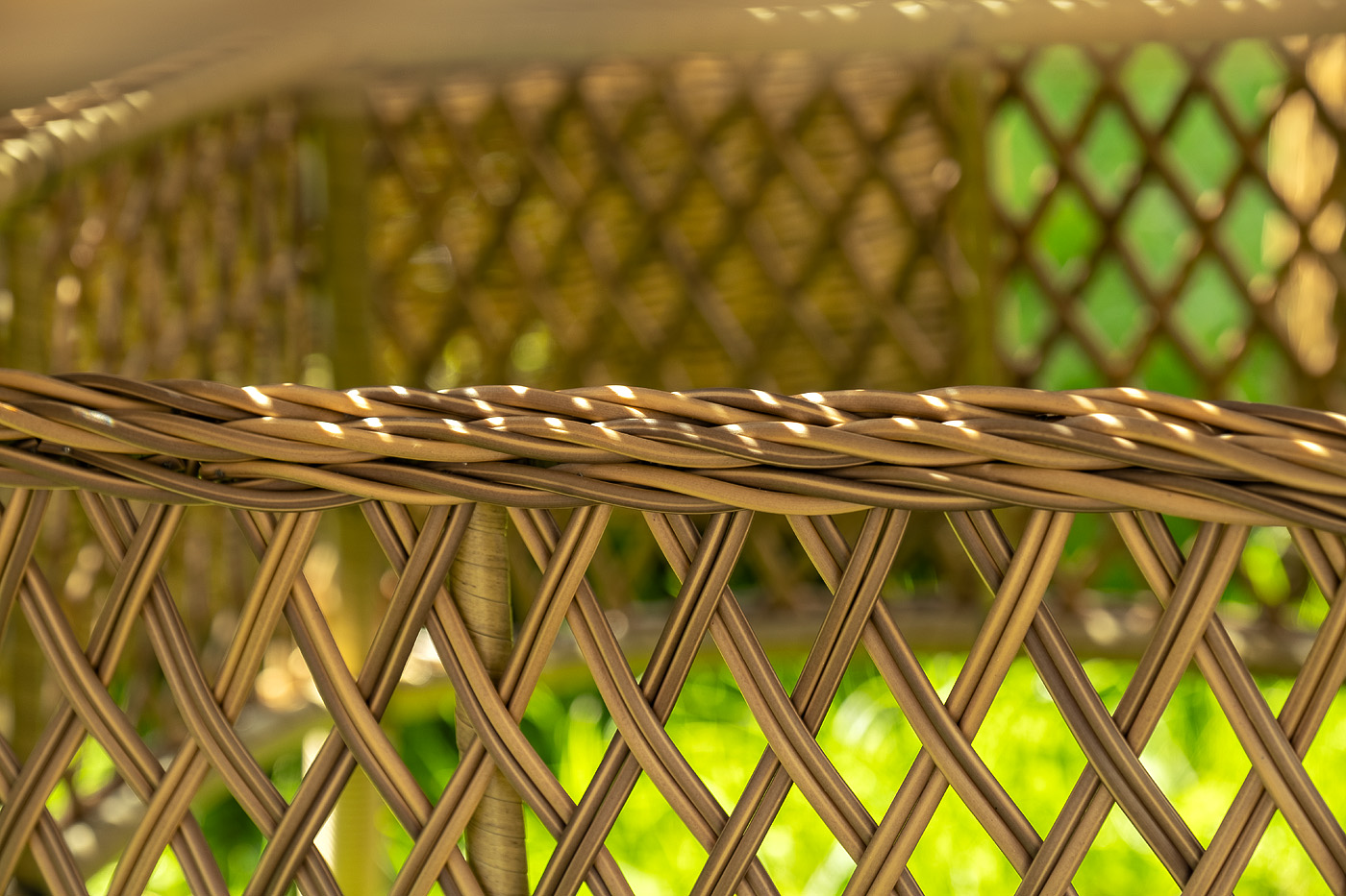 Вся мебель изготовлена из долговечного и легкого алюминия, обтянутого синтетическим ротангом. На столе для удобства эксплуатации предусмотрена столешница из ударопрочного закаленного стекла 5 мм. Стулья укомплектованы подушками на сидениях и на спинках.