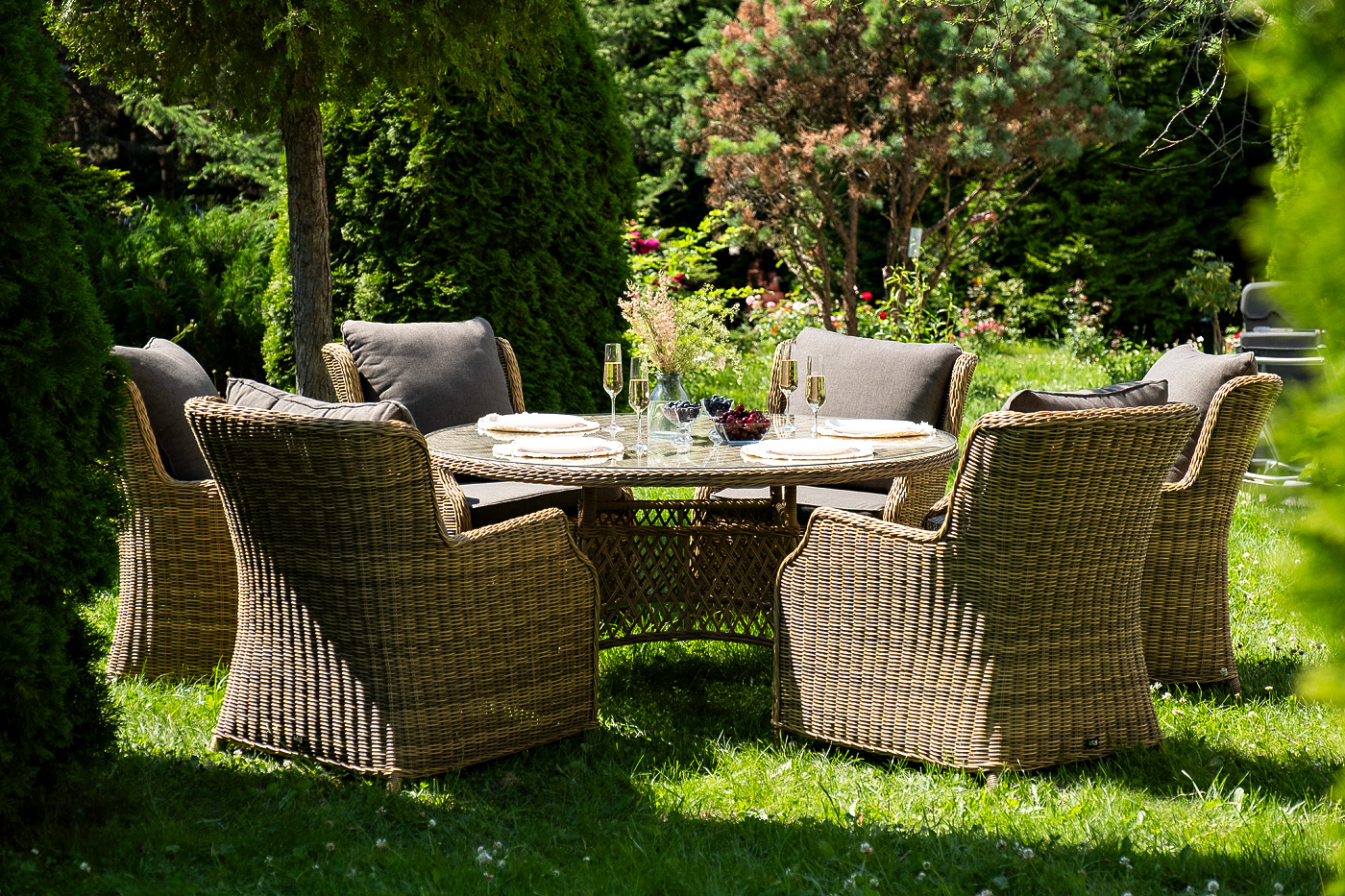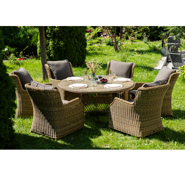 Обеденная группа на 6 персон «Эспрессо» из ротанга. В комплекте: большой круглый обеденный стол (1500×1500×750 мм.) и 6 кресел коллекции «Неаполь» (650×900×920 мм).