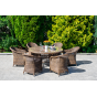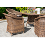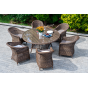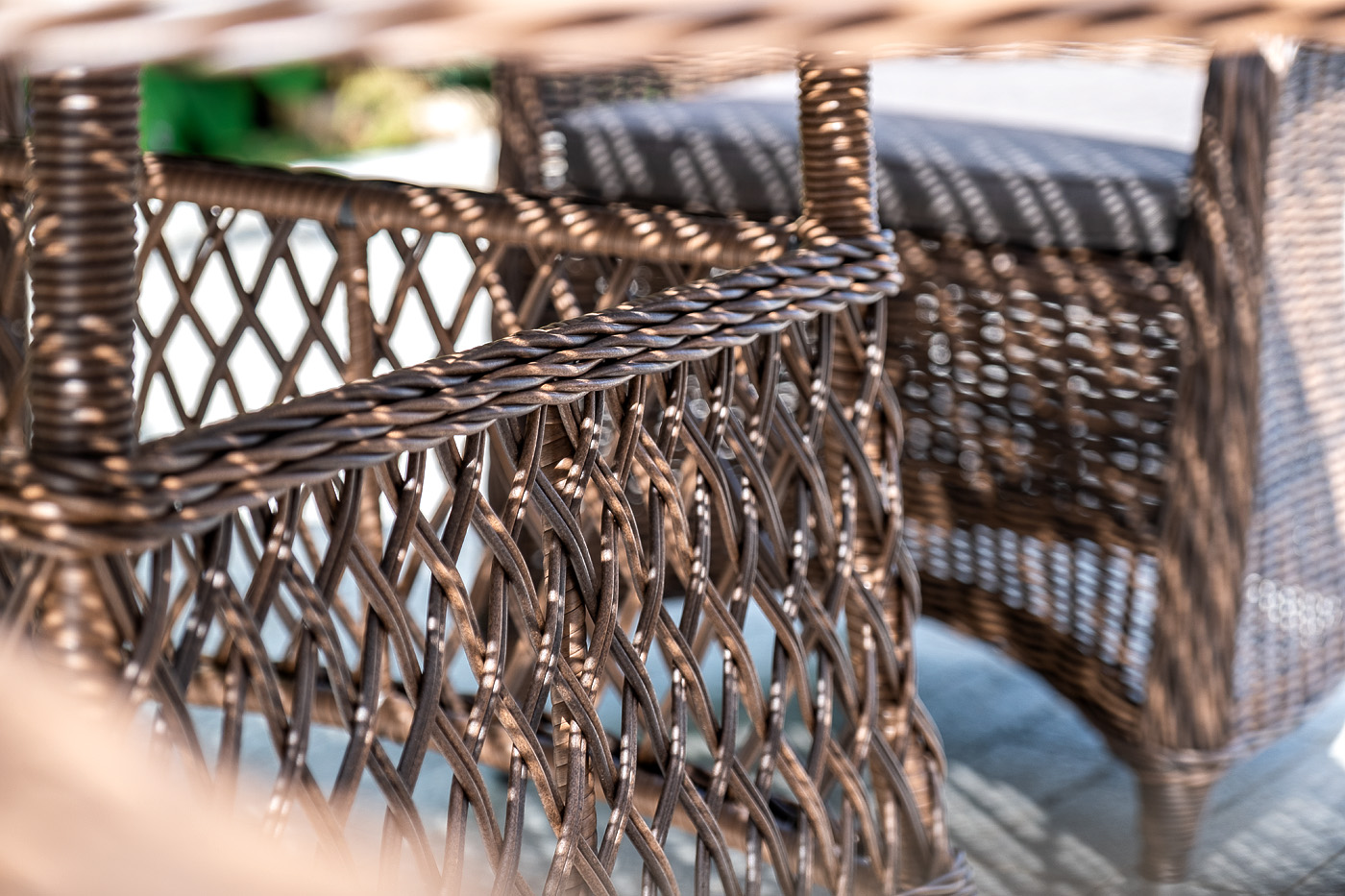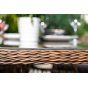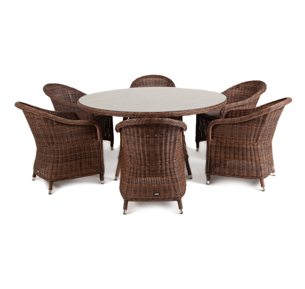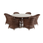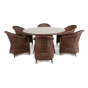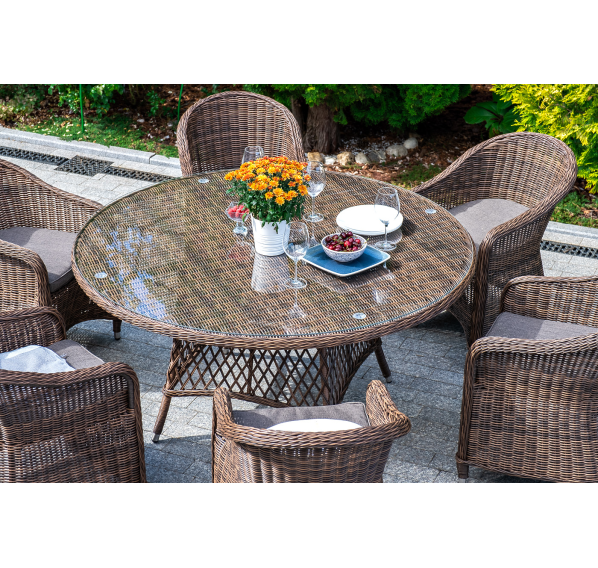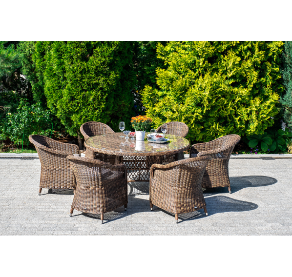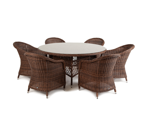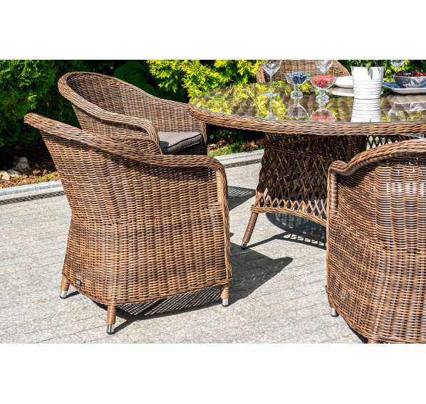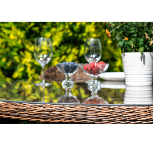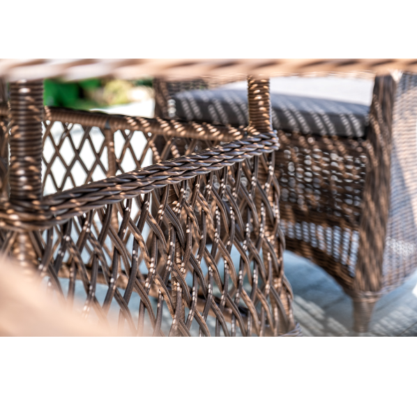 Вся мебель изготовлена из долговечного и легкого алюминия, обтянутого синтетическим ротангом. На столе для удобства эксплуатации предусмотрена столешница из ударопрочного закаленного стекла 5 мм. Стулья укомплектованы подушками на сидениях.