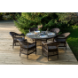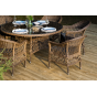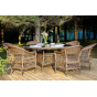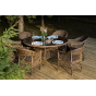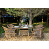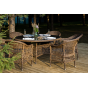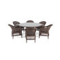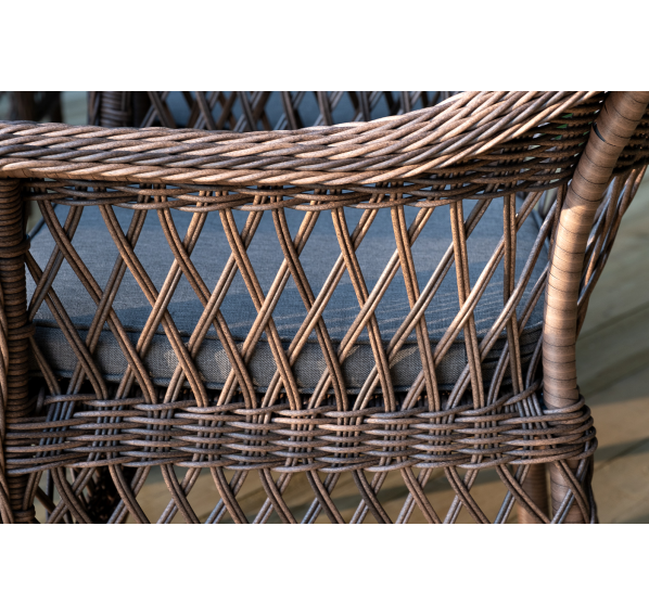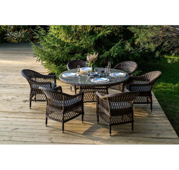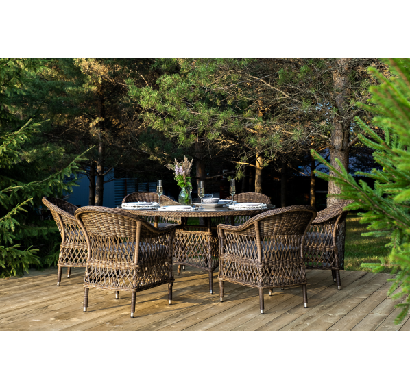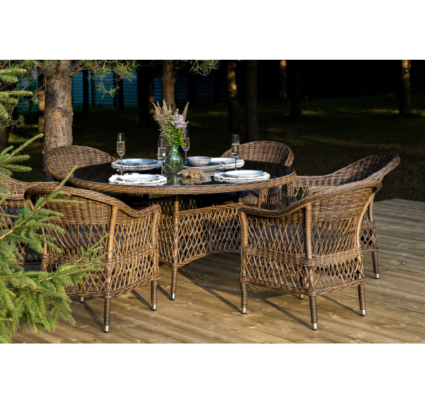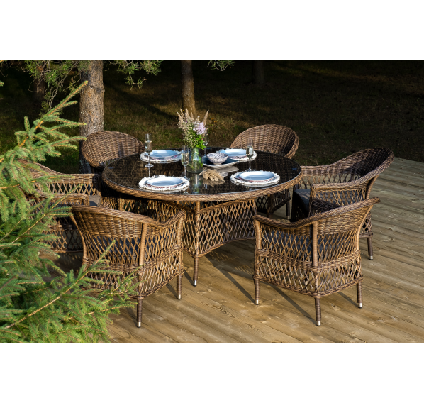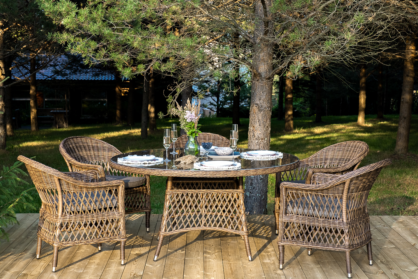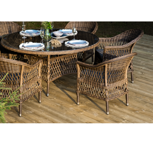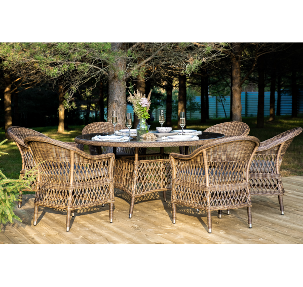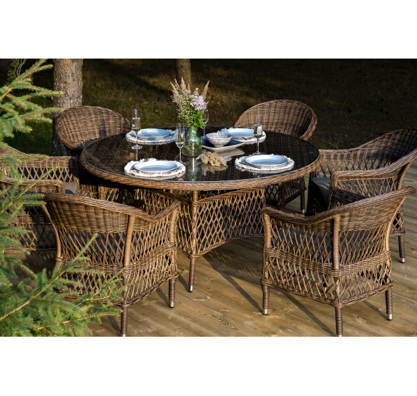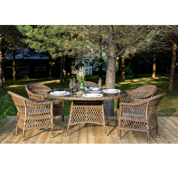 Вся мебель изготовлена из долговечного и легкого алюминия, обтянутого синтетическим ротангом. На столе для удобства эксплуатации предусмотрена столешница из ударопрочного закаленного стекла 5 мм. Стулья укомплектованы подушками на сидениях.