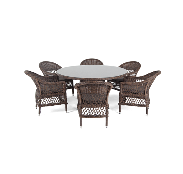 В комплект входит круглый обеденный стол «Эспрессо» (1500×1500×750 мм) с ударопрочной стеклянной столешницей и 6 кресел коллекции «Сицилия» (590×640×820 мм).