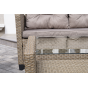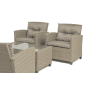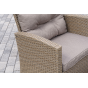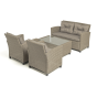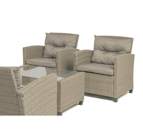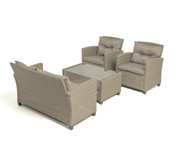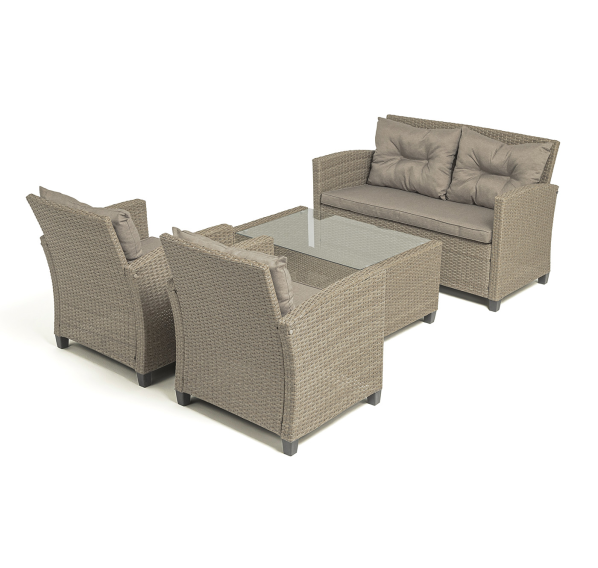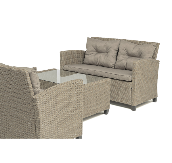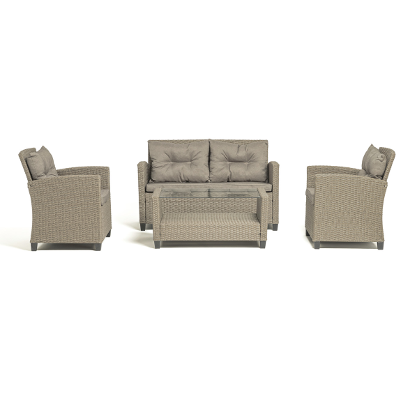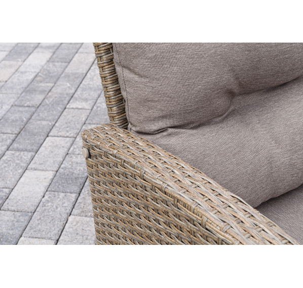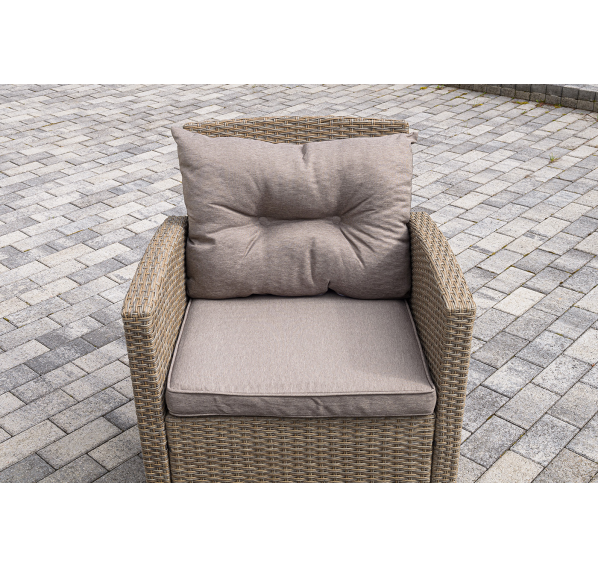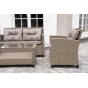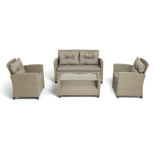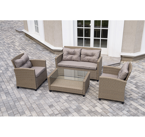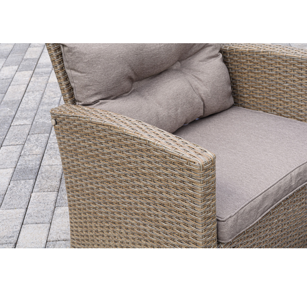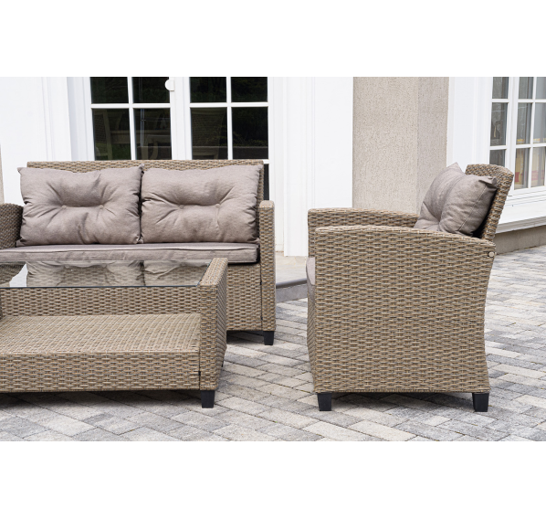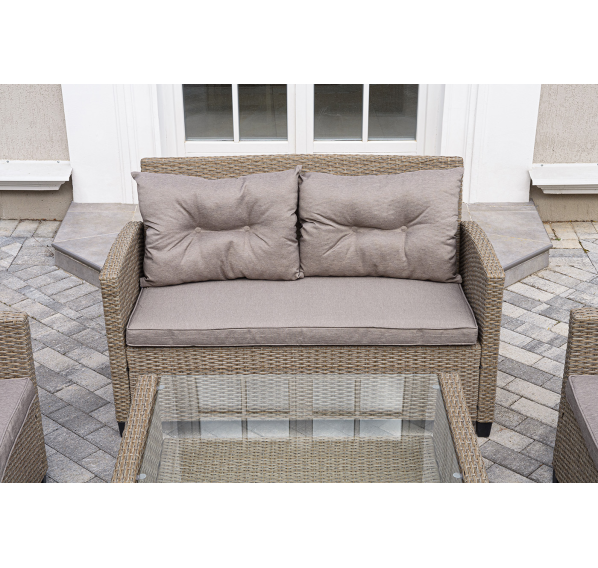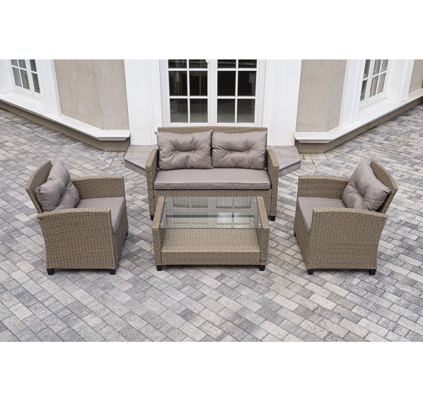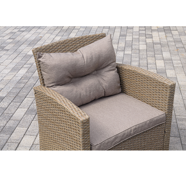 Плетеная мебель дополнена удобными подушками в бежевых чехлах. При их изготовлении используют полиэстер, плотность – 230гр/м2.