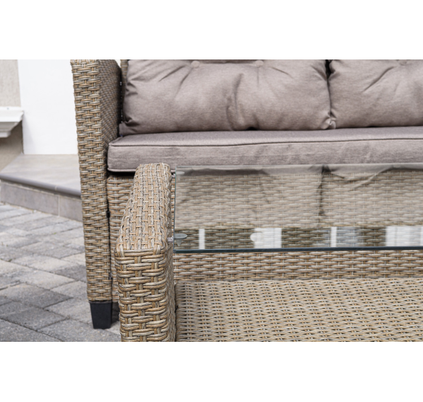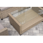 Стол выполнен из стали, вручную оплетенного круглым искусственным ротангом. Столешница из закаленного стекла толщиной 5 мм.