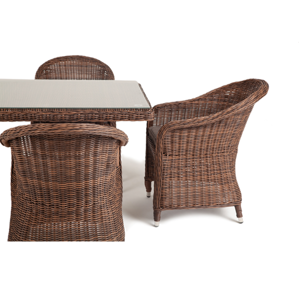 Каркас мебели выполнен из легкого и долговечного алюминия, оплетенного вручную синтетической ротанговой лозой. Кресла идут с подушками в комплекте. Материал столешницы – ударопрочное стекло 5 мм.