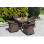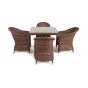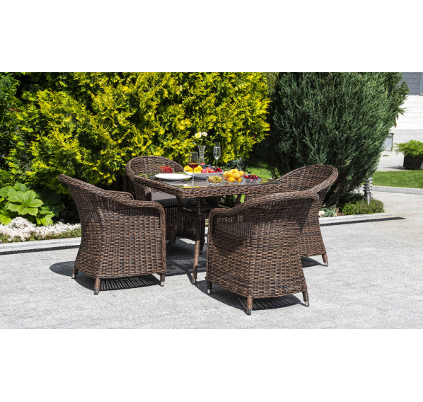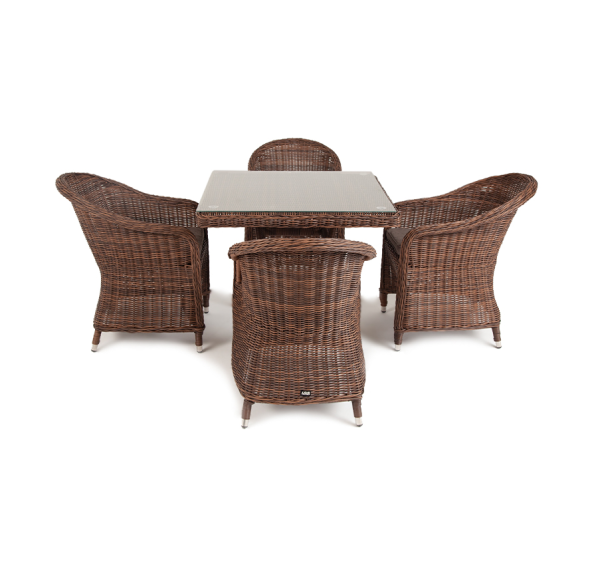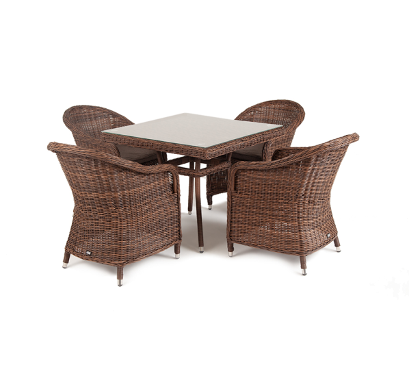 Обеденная группа «Фредо» для сада, веранды, летней площадки ресторана. В набор входит квадратный стол «Айриш» (900×900×750 мм) и 4 кресла «Равенна» (570×680×810 мм) в насыщенном коричневом оттенке.