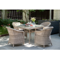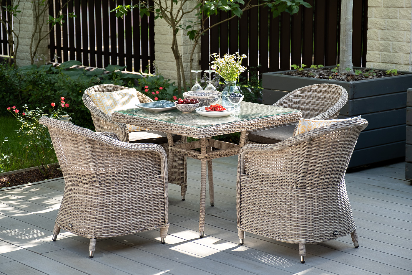 Обеденная группа «Фредо» для сада, веранды, летней площадки ресторана. В набор входит квадратный стол «Айриш» (900×900×750 мм) и 4 кресла «Равенна» (570×680×810 мм) в натуральном бежевом оттенке.