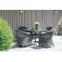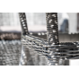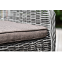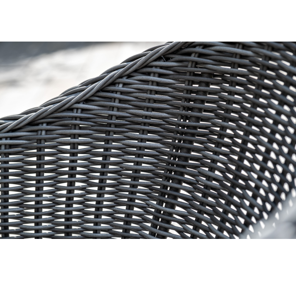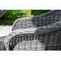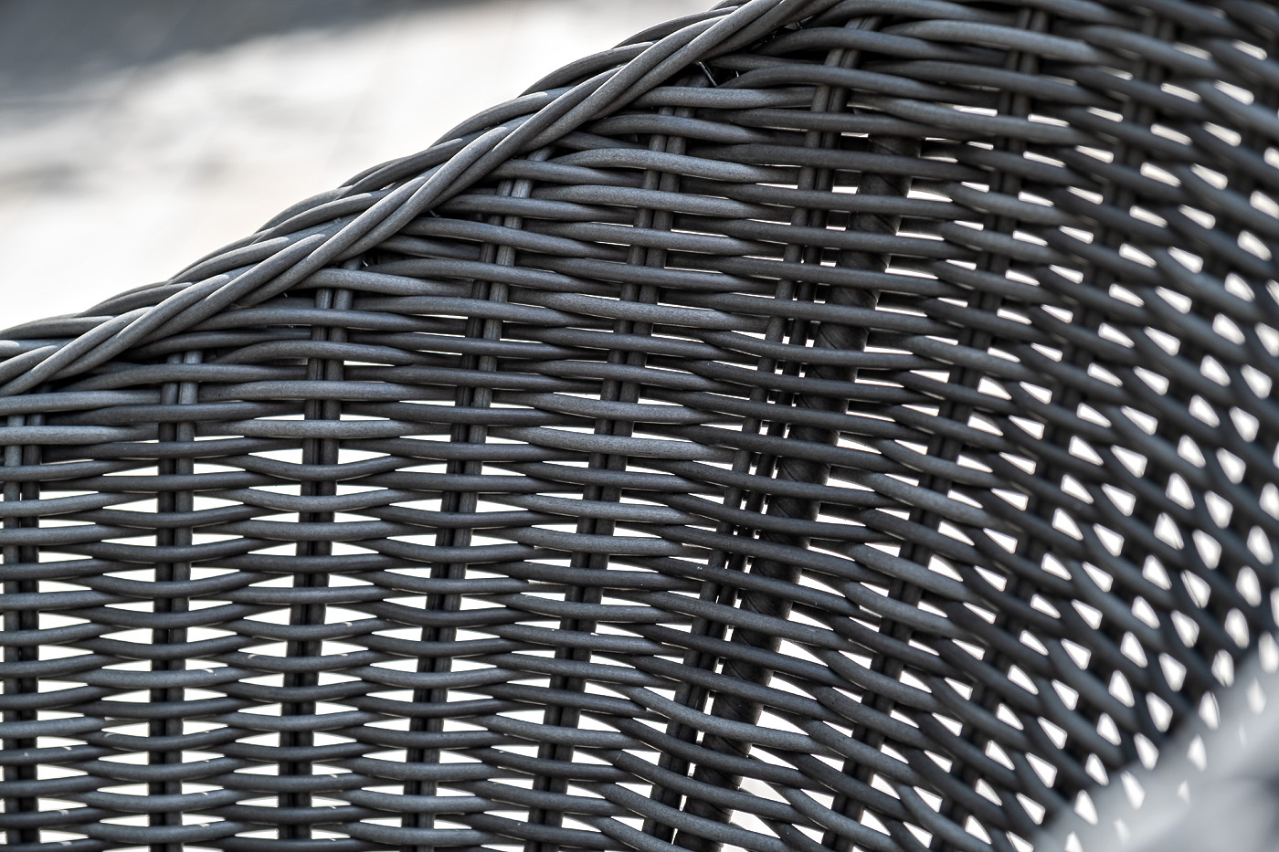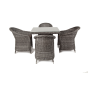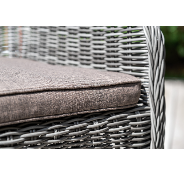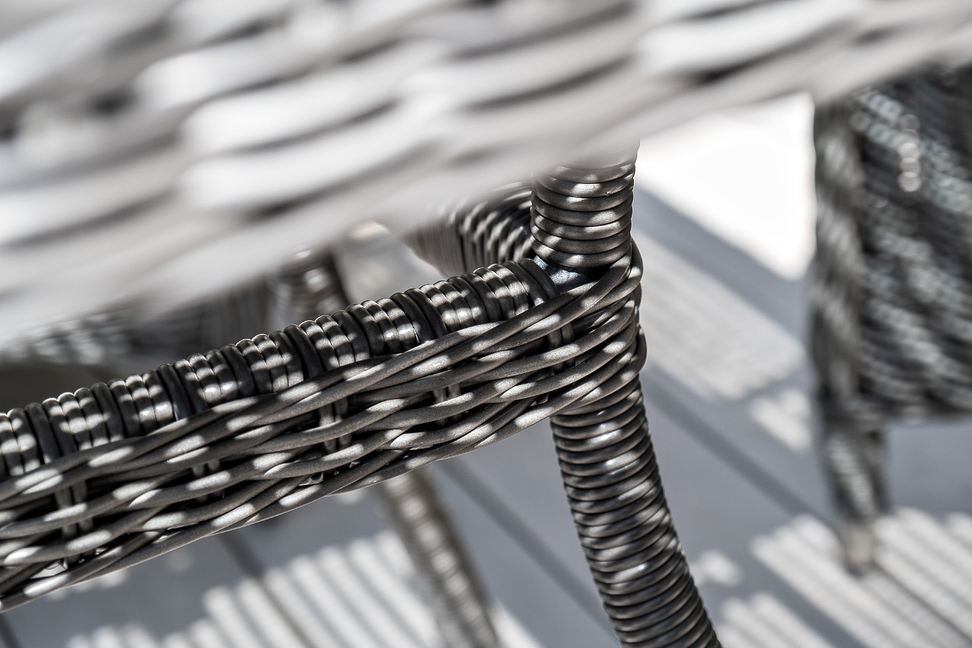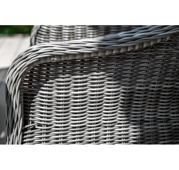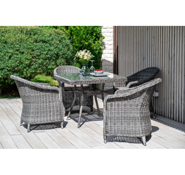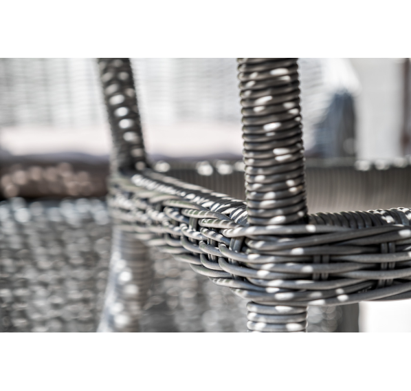 Вся мебель изготовлена из алюминия, поэтому ее очень легко перемещать. Декоративное покрытие выполнено из долговечного искусственного ротанга, устойчивого к перепадам температур и переменам погоды. Столешница изготовлена из прочного закаленного стекла 5 мм, кресла укомплектованы подушками серого цвета со съёмными чехлами.
