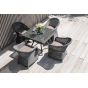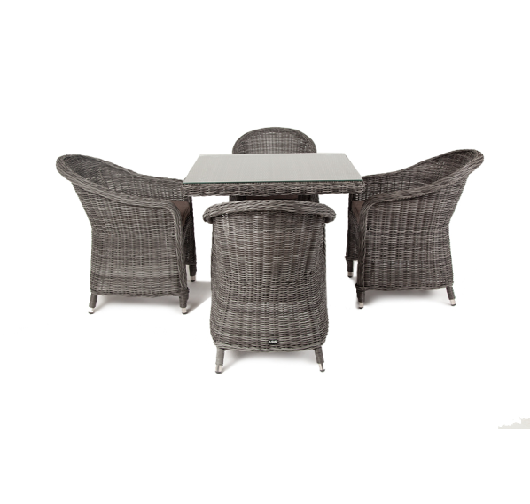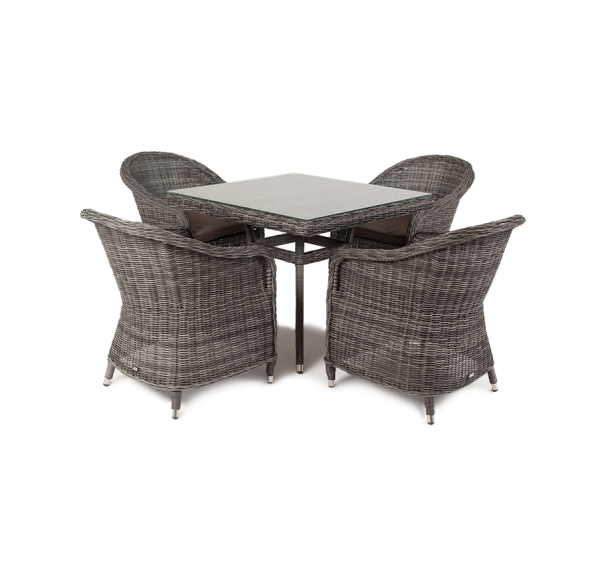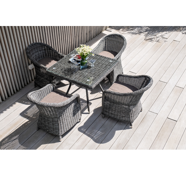 Уличная обеденная группа «Фредо» для обустройства зоны отдыха. Комплект состоит из: квадратного обеденного стола «Айриш» - 900×900×750 мм и 4 кресел «Равенна» - 570×680×810 мм в графитовом цвете.