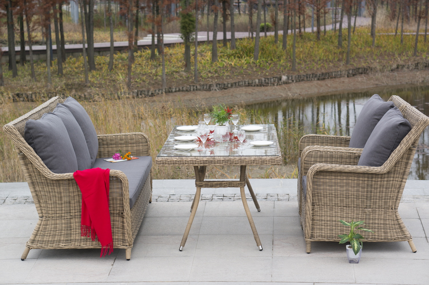 Каркас мебели алюминиевый. Он оформлен с помощью искусственного ротанга круглой формы и был оплетен ручным способом. Цвет плетение - соломенный.