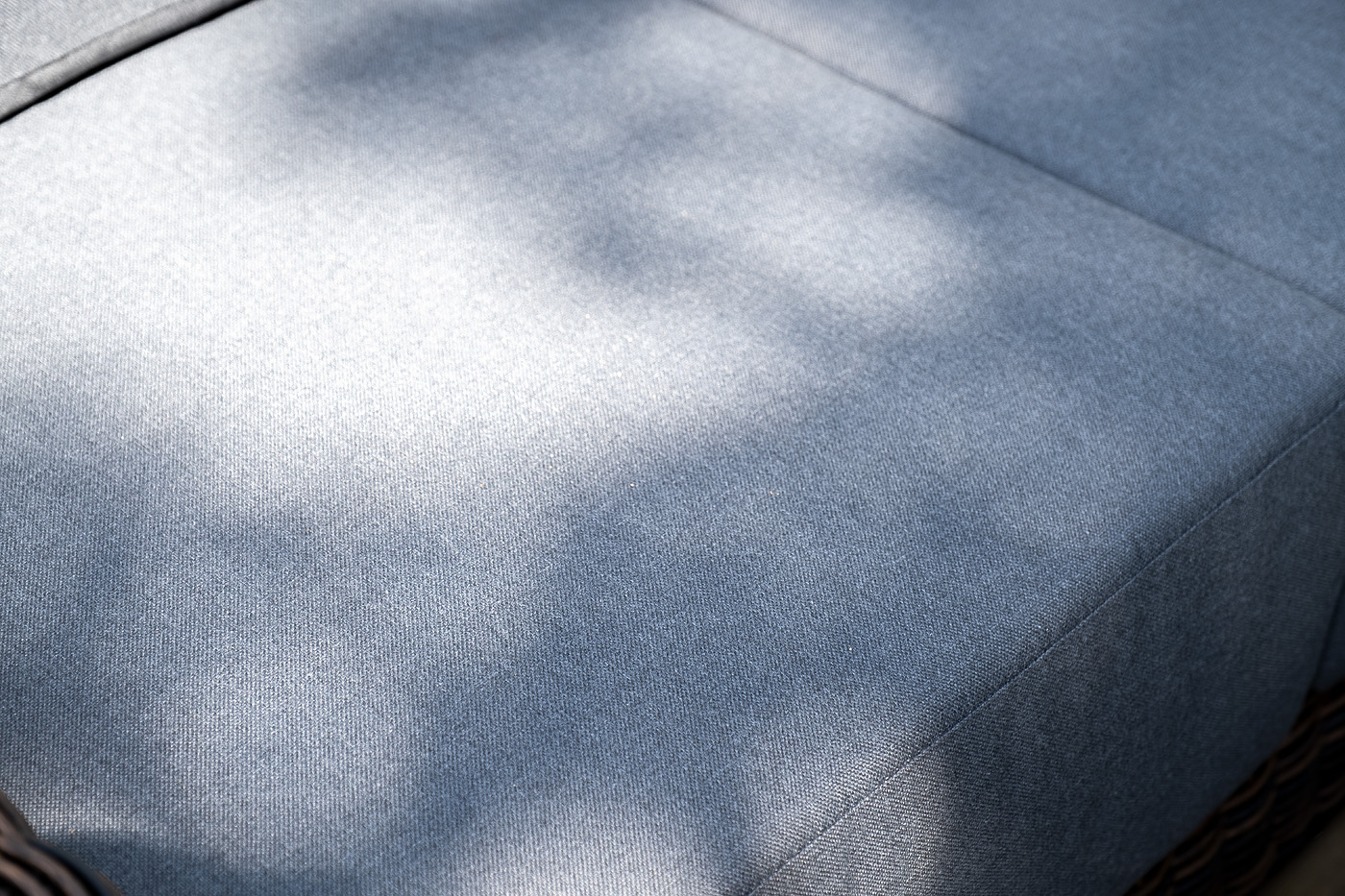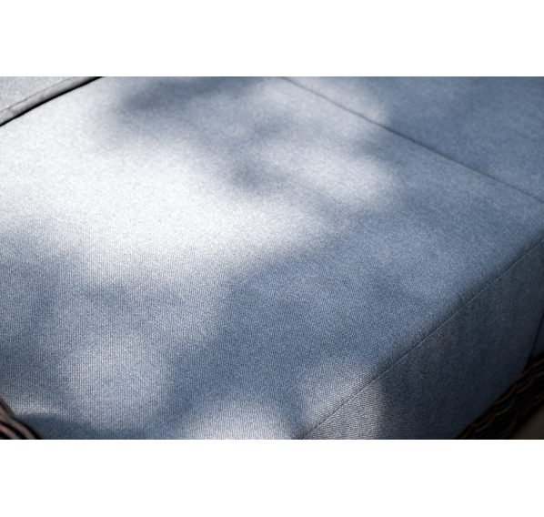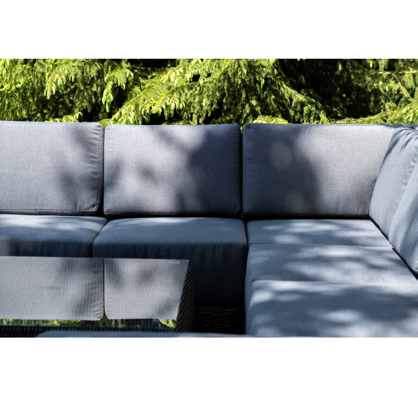 Модули дивана и кушетка укомплектованы подушками со съемными чехлами серого цвета. Они состоят из полиэстера с плотностью 300гр/м2. Защитные качества материала усилены путем его обработки влагоотталкивающими составами.