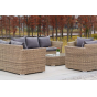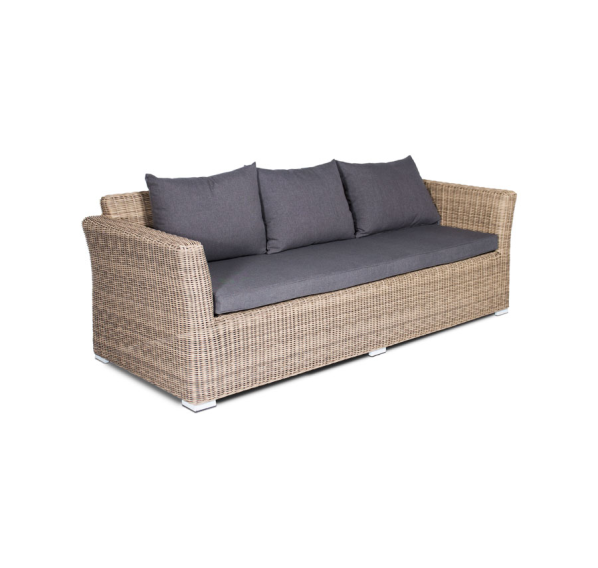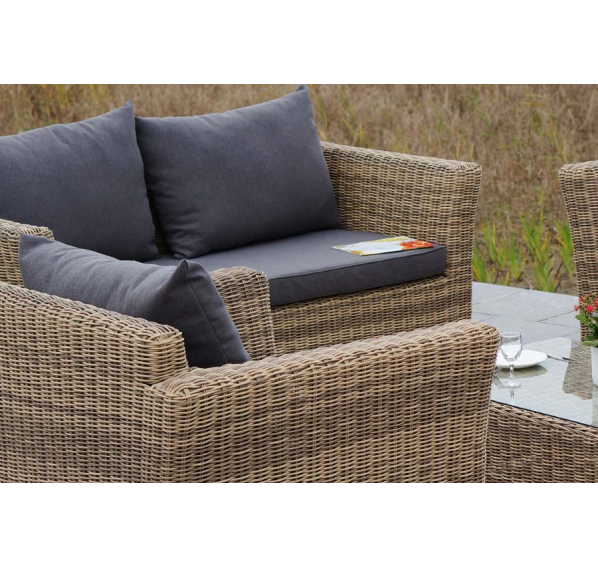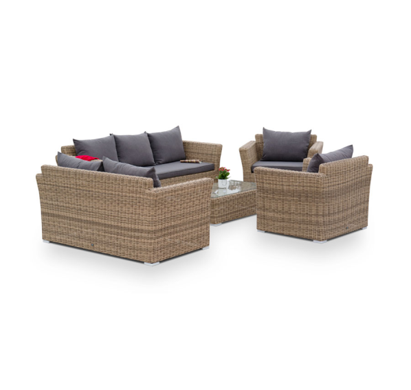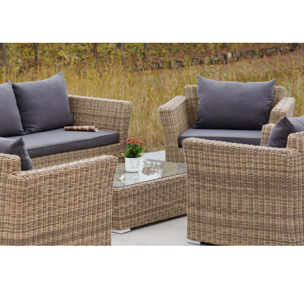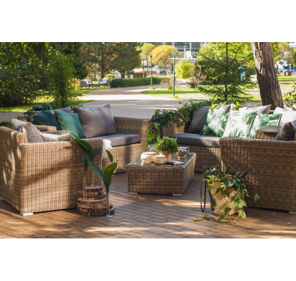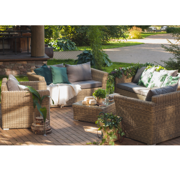 Садовые диваны и кресла поставляются вместе с подушками. Они упакованы в съёмные чехлы, которые при необходимости можно стирать. Для их производства берется полиэстер, плотность 300гр/м2. Материал защищен с помощью влагоотталкивающих составов. Цвет подушек – серый.