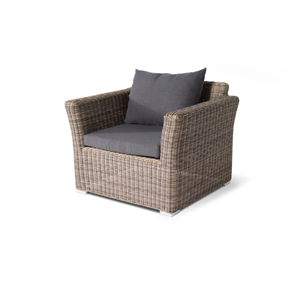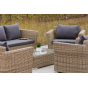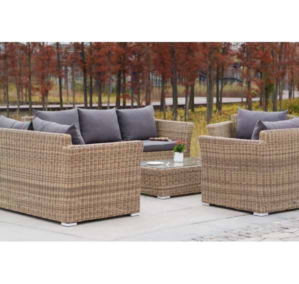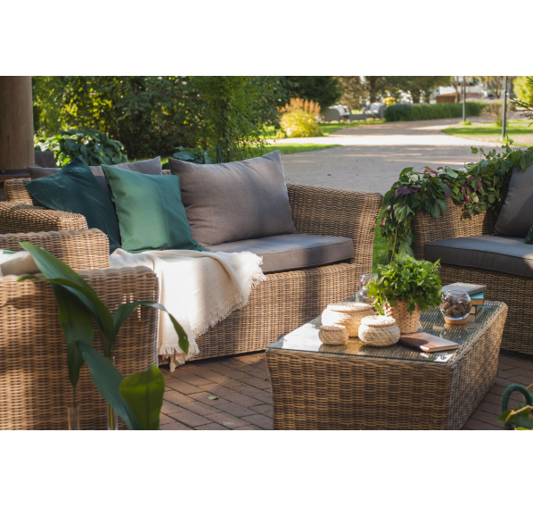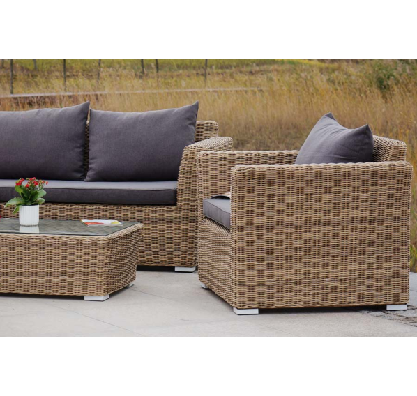 Прочность каркасу мебели обеспечивает алюминий. Из искусственного ротанга соломенного оттенка создана оригинальная ручная оплетка, которая выступает в качестве основного декора.
