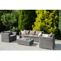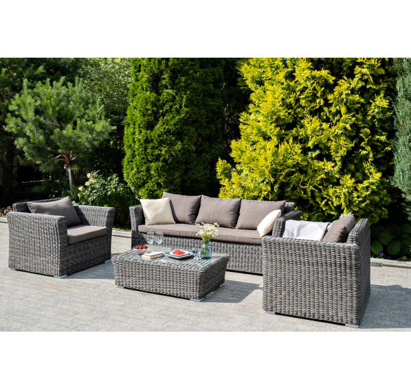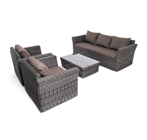 Кресла и диван идут в комплекте с подушками с серыми чехлами. Они пошиты из качественного полиэстера с плотностью 300гр/м2. Материал предварительно проходит обработку влагоотталкивающей пропиткой. Столик дополнен практичной столешницей из стекла толщиной 5 мм.