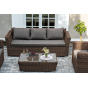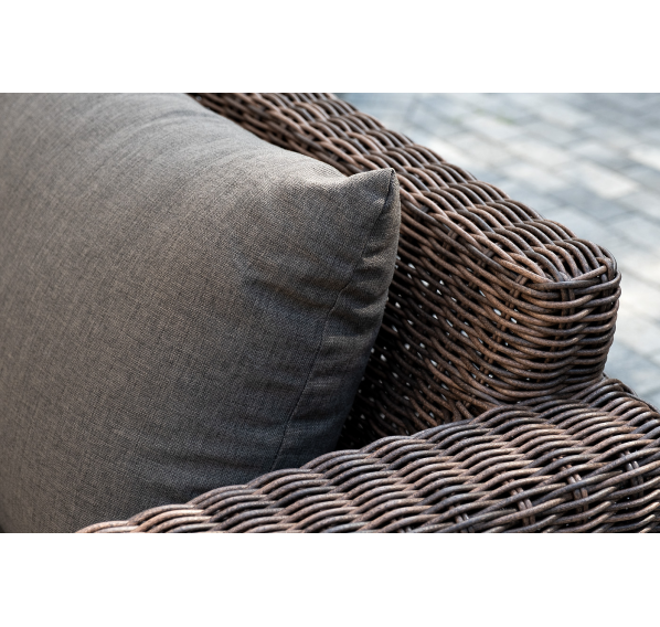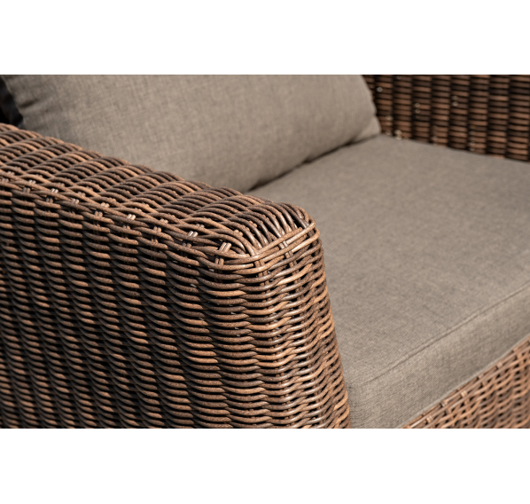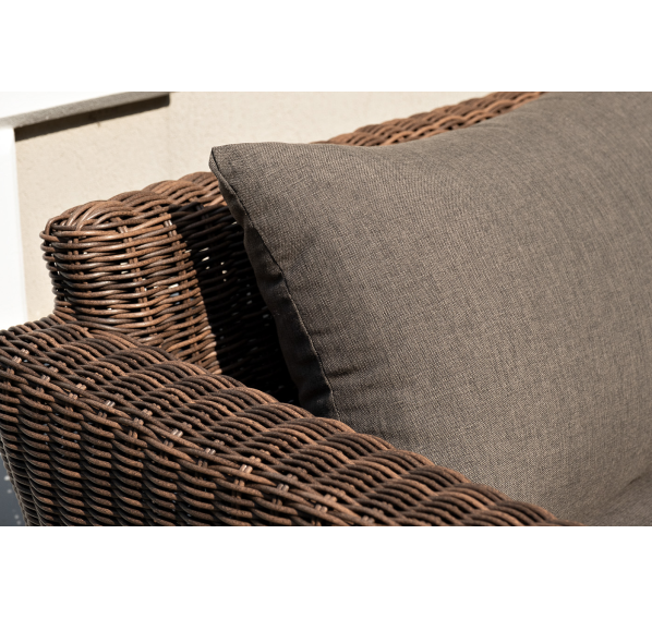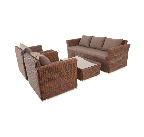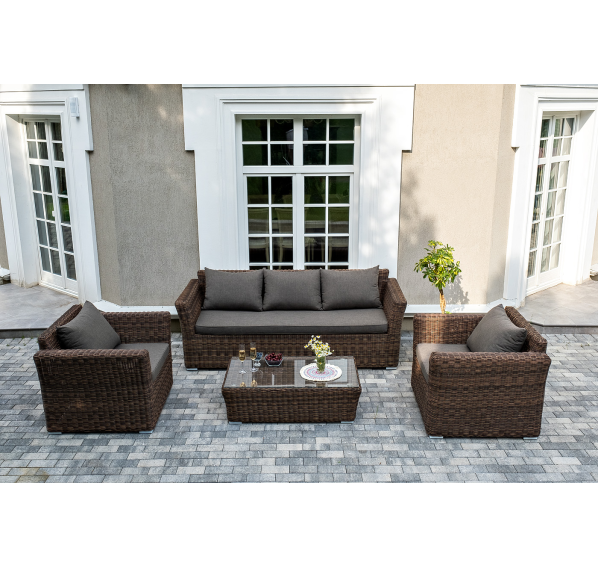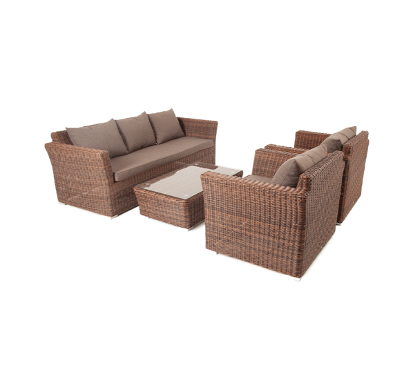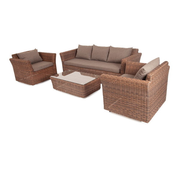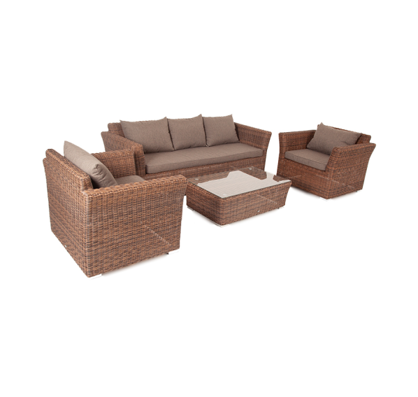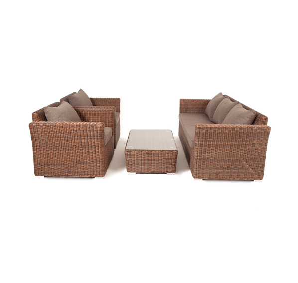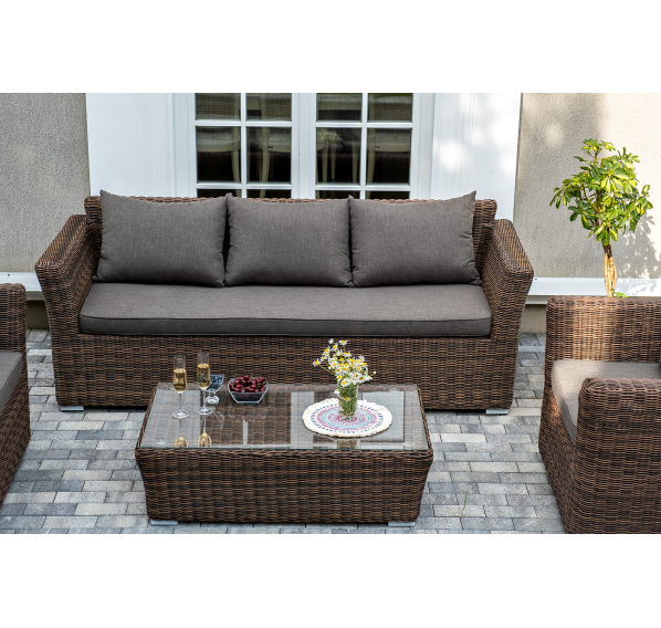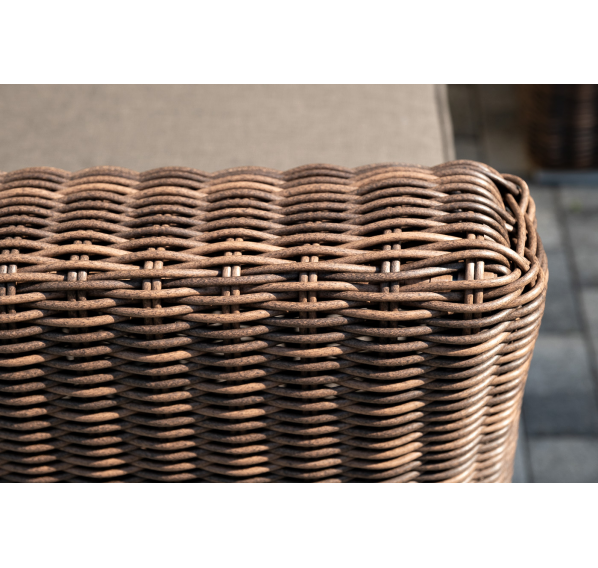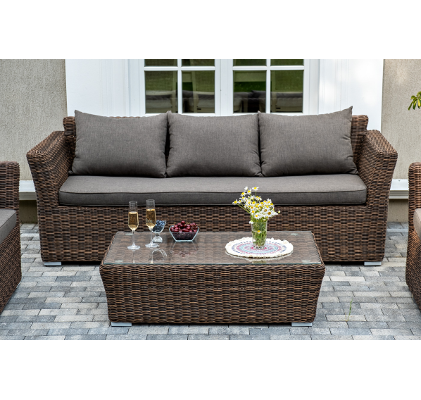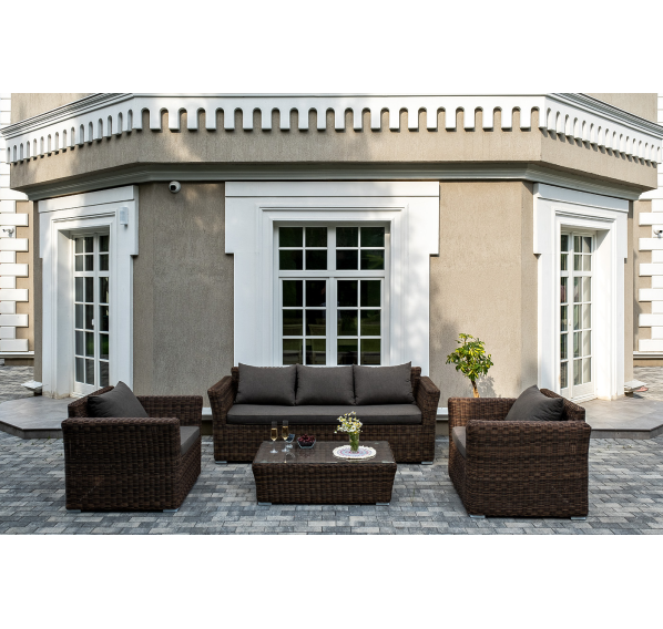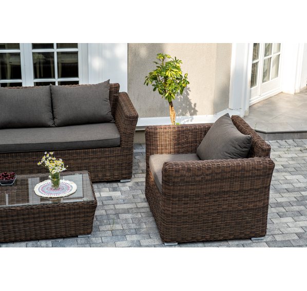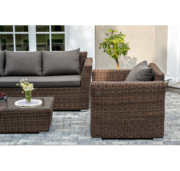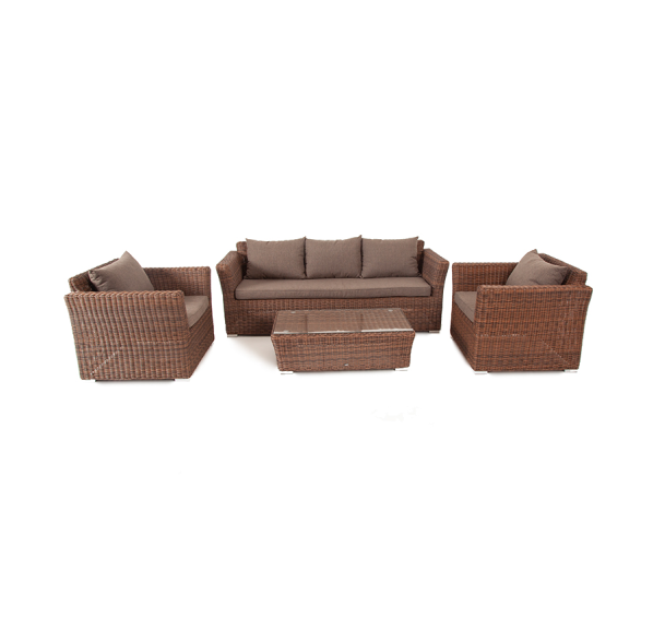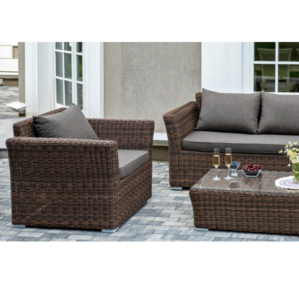 В качестве основы применяется алюминиевый каркас. Из круглого искусственного ротанга сделана ручная оплетка. Цвет комплекта – коричневый.