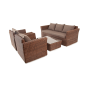 На креслах и диване расположились мягкие подушки, съёмные чехлы которых пошиты из полиэстера, плотностью 300гр/м2. Ткань в обязательном порядке пропитывается влагоотталкивающими составами.