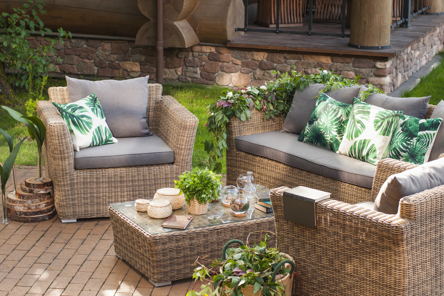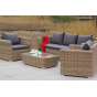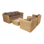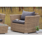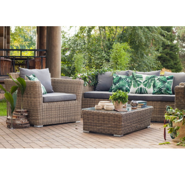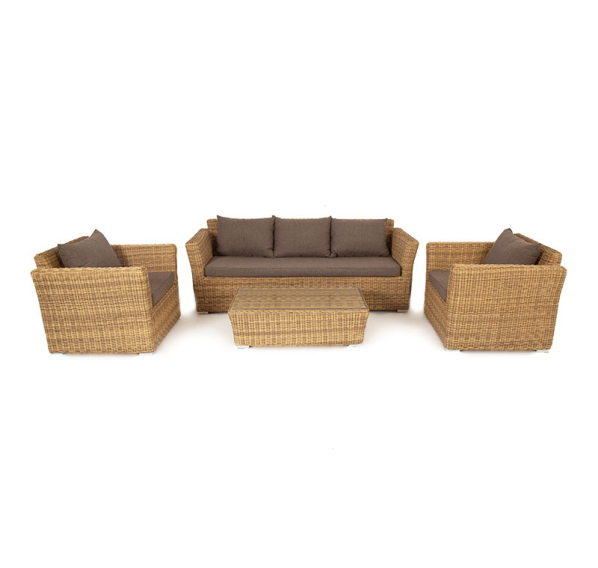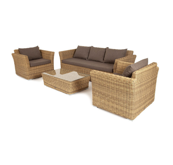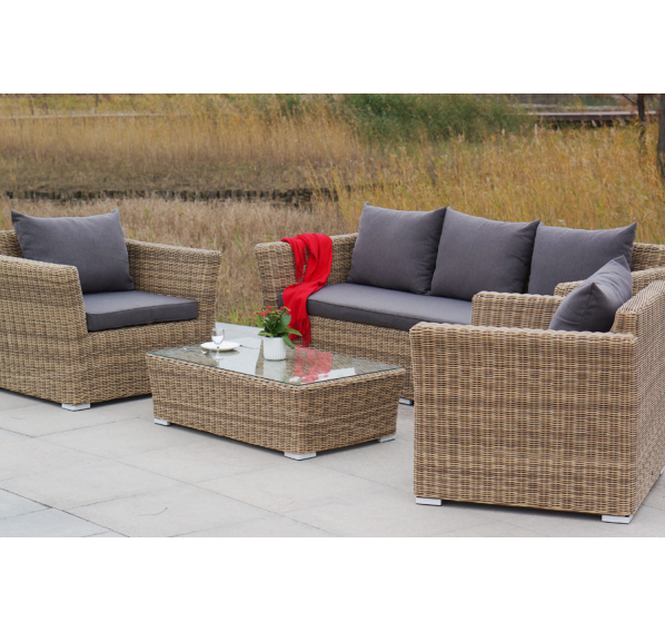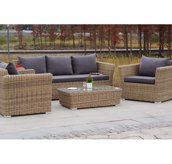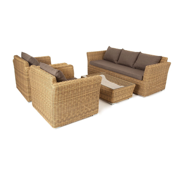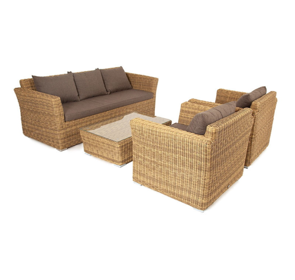 Из алюминия сделан устойчивый каркас мебели. Ее поверхность дополнена искусственным ротангом, из которого сделано ручное плетение, цвет соломенный.