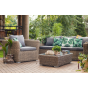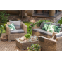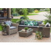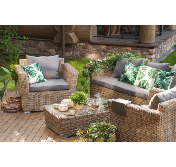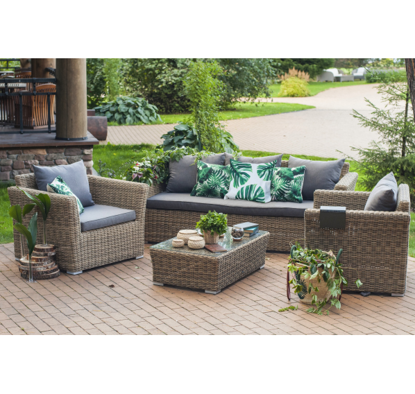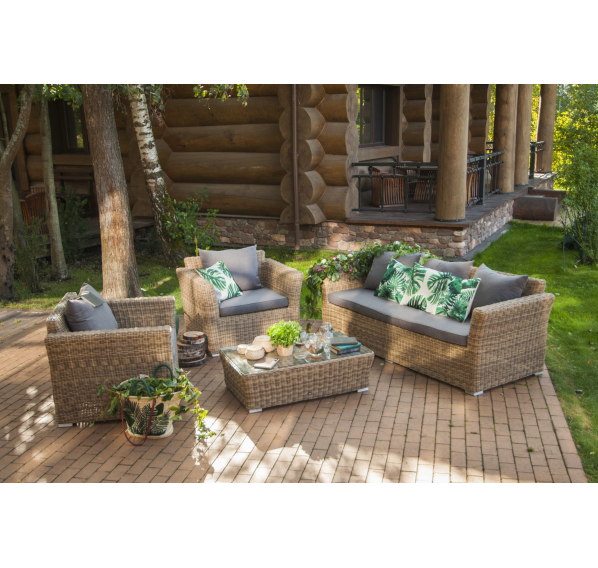 Кресла и диван идут в комплекте с подушками с серыми чехлами. Они пошиты из качественного полиэстера с плотностью 300гр/м2. Материал предварительно проходит обработку влагоотталкивающей пропиткой. Столик дополнен практичной столешницей из стекла толщиной 5 мм.