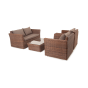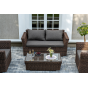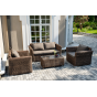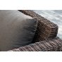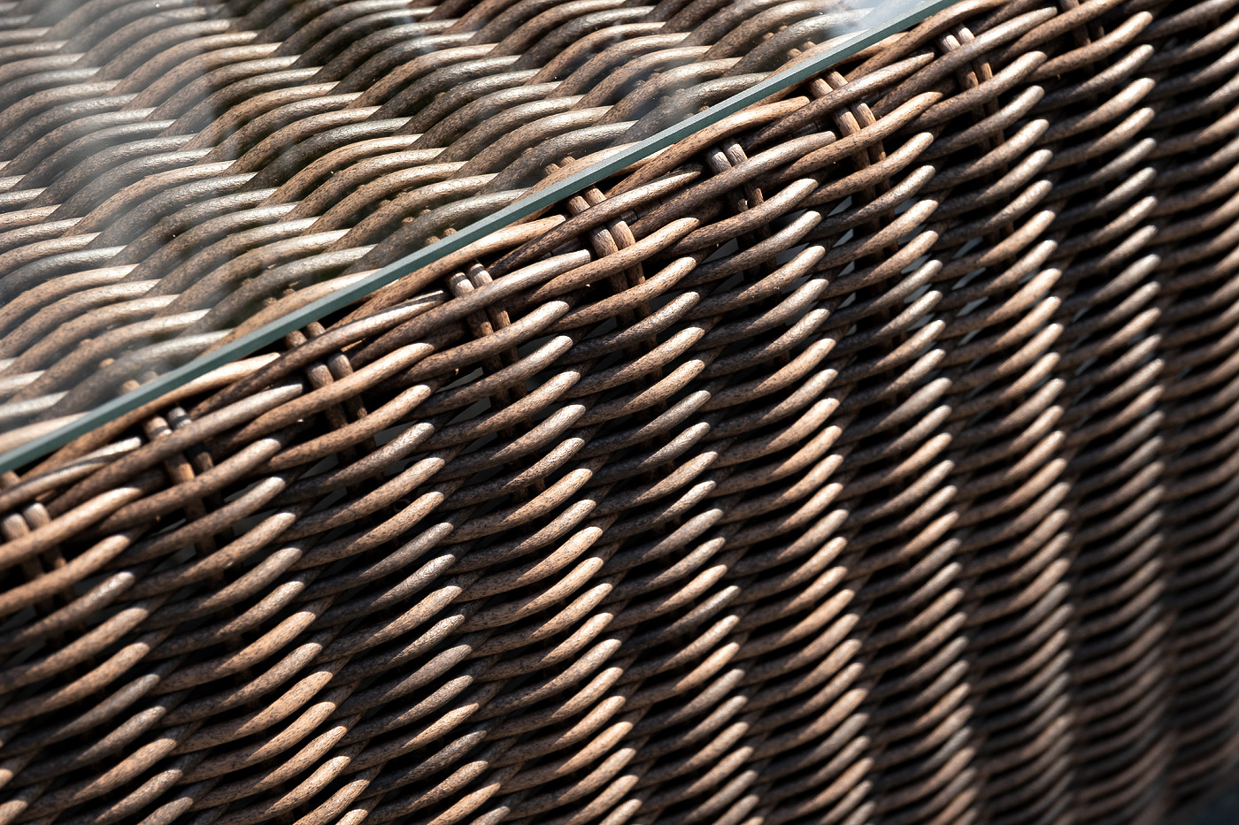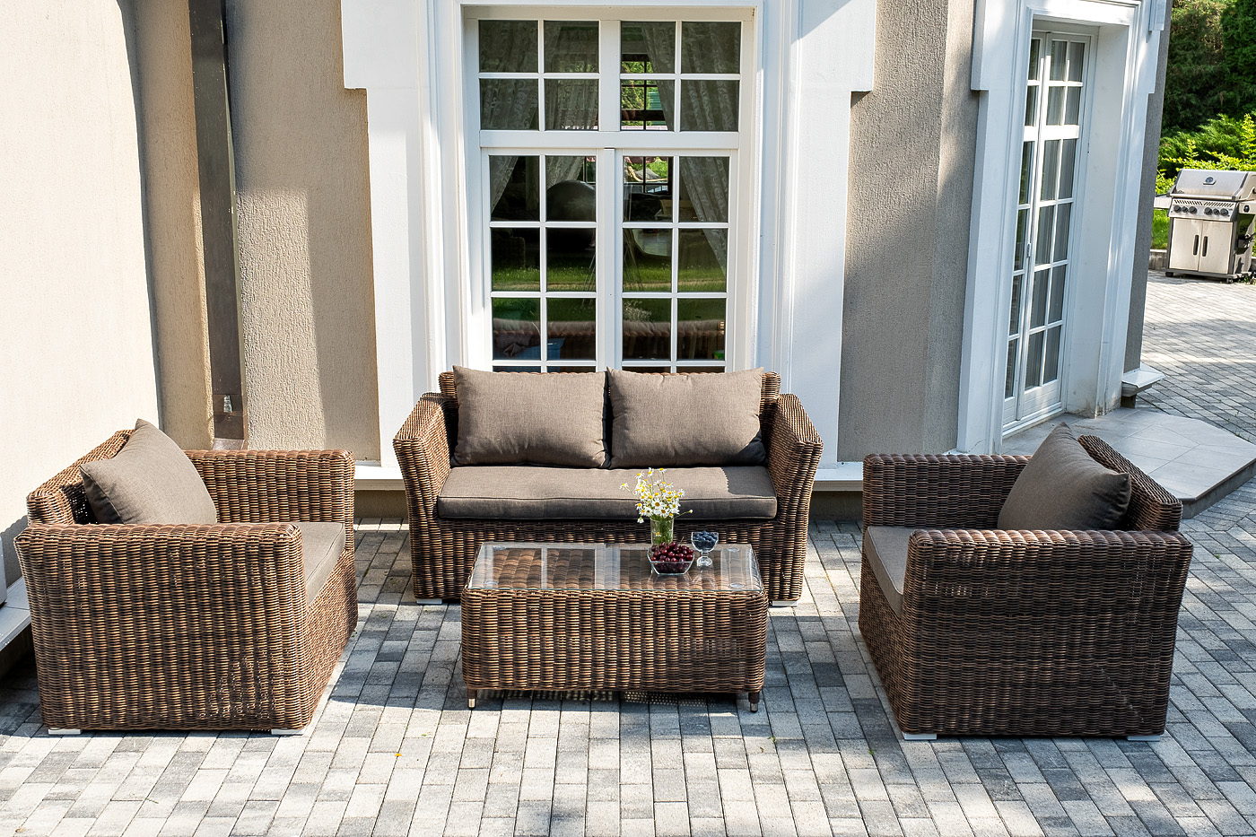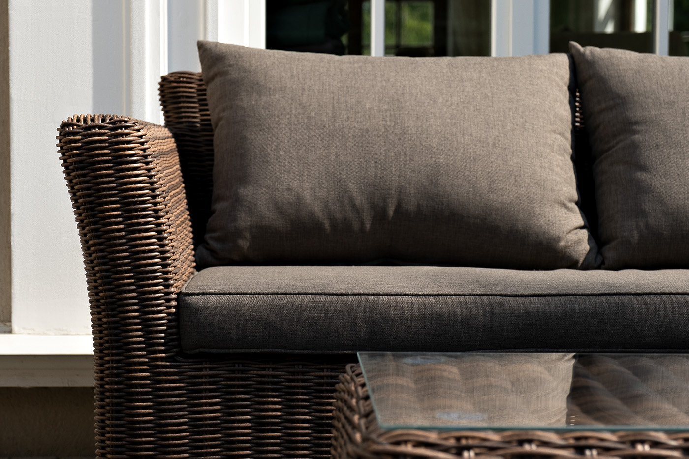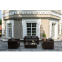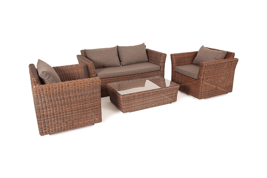 Мебель изготовлена из алюминиевого каркаса и круглого искусственного ротанга, которым вручную оплетается корпус. Цвет комплекта – коричневый.
