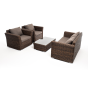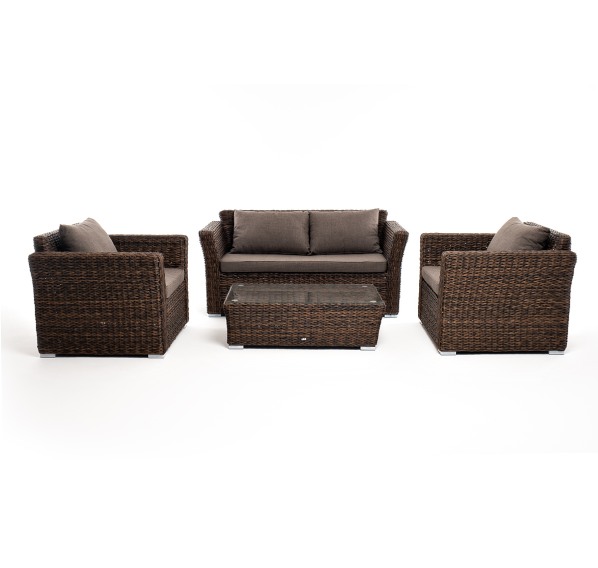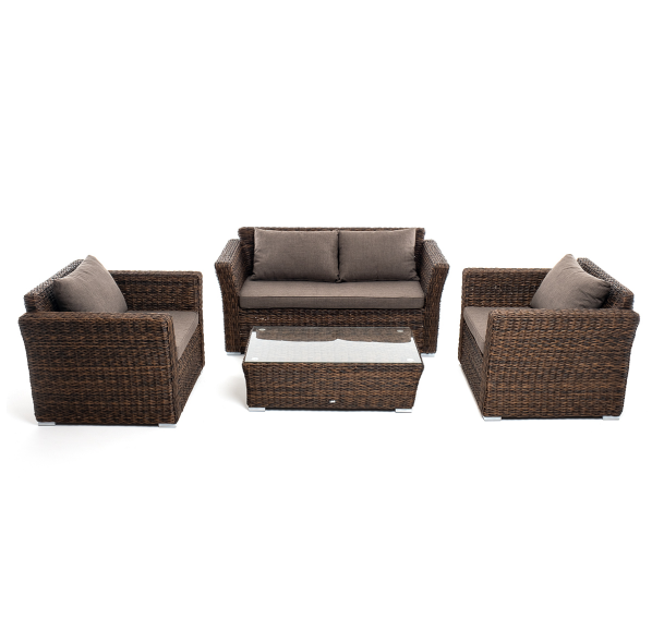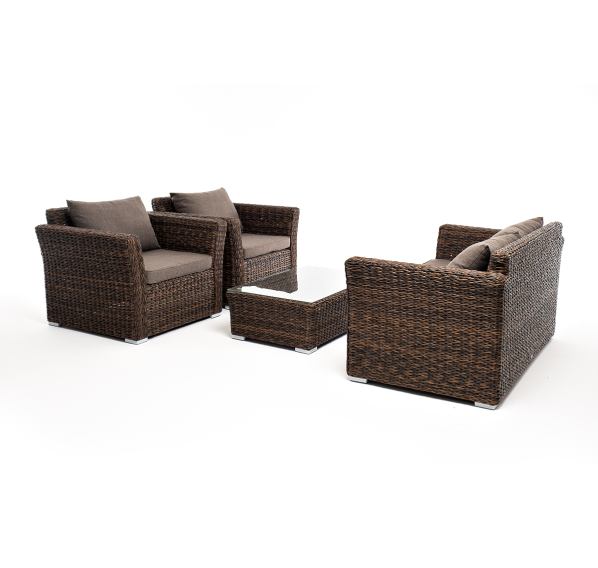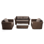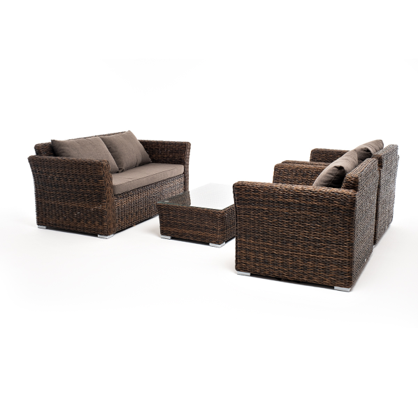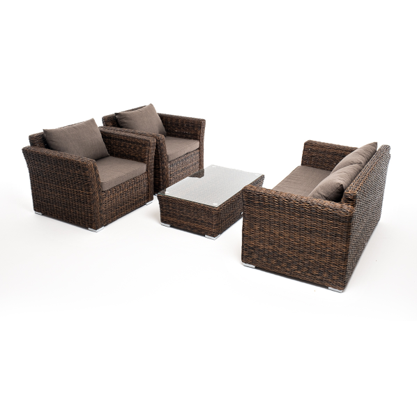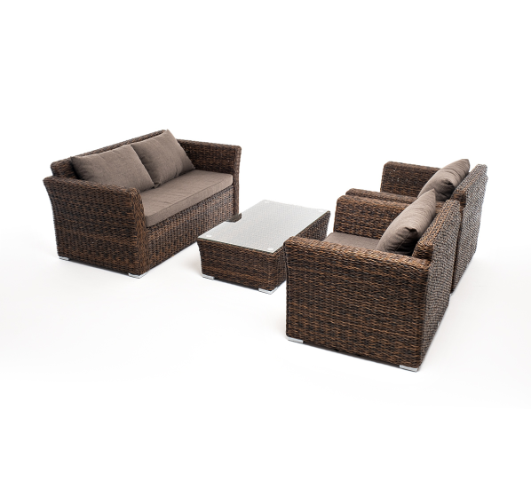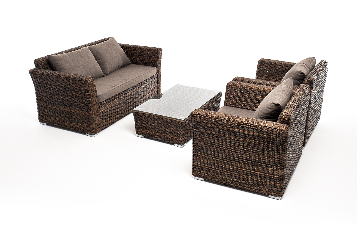 Мебель изготовлена из алюминиевого каркаса и круглого искусственного ротанга "вида гиацинт". Цвет комплекта – коричневый.