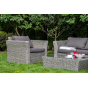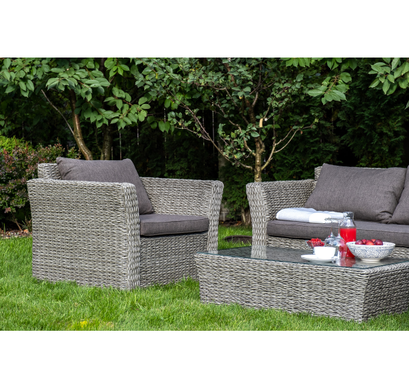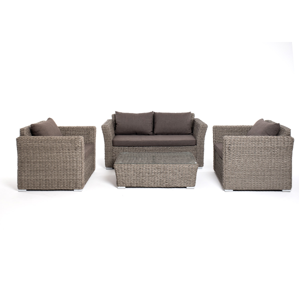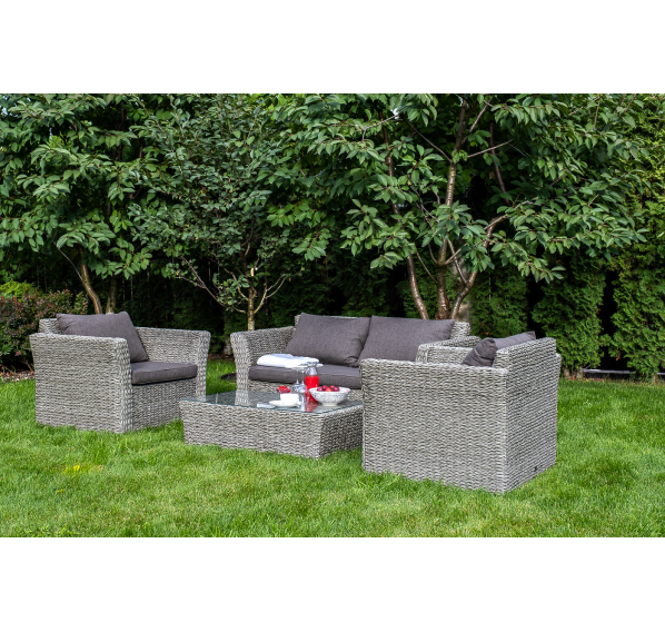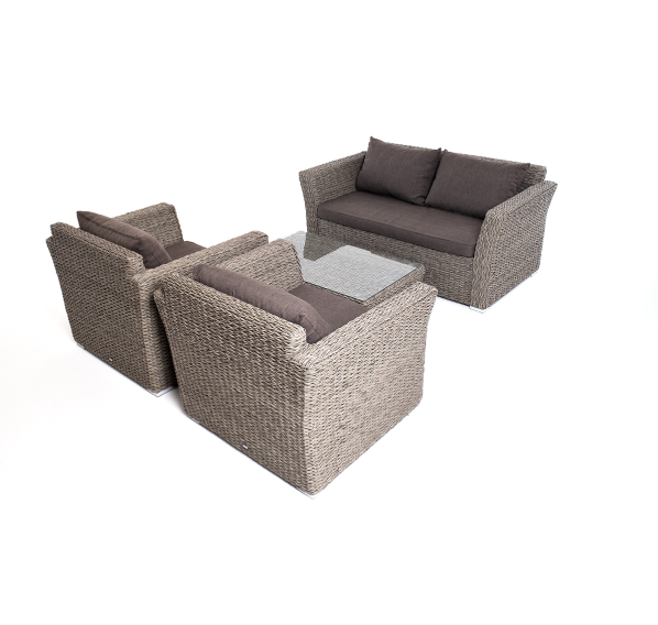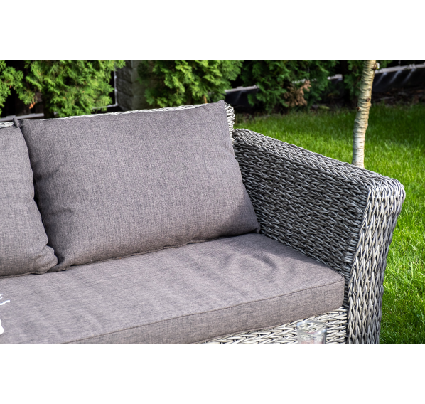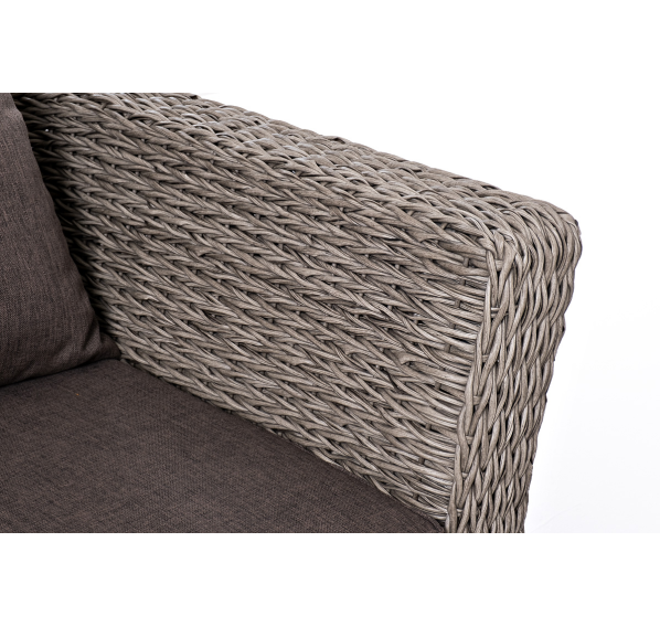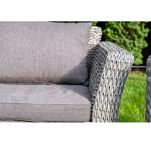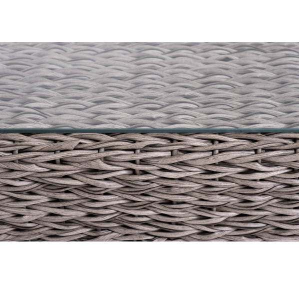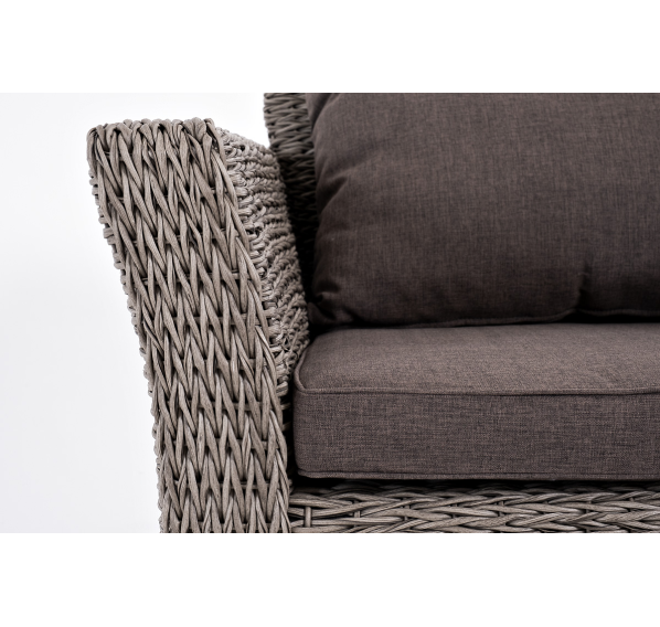 Прочный алюминиевый каркас усиливает устойчивость мебели. Его дополняет плетение в сером цвете, которое представлено из искусственного ротанга вида "гиацинт".