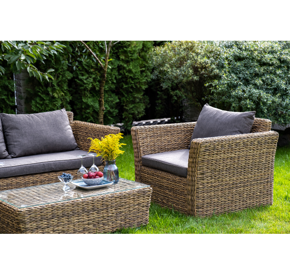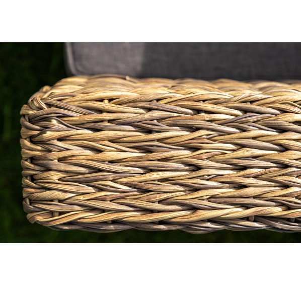 Прочный алюминиевый каркас усиливает устойчивость мебели. Его дополняет соломенная оплетка, которая представлена из искусственного ротанга вида "гиацинт".
