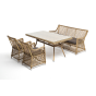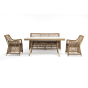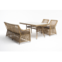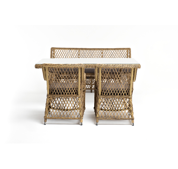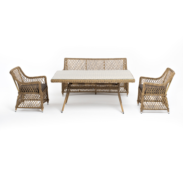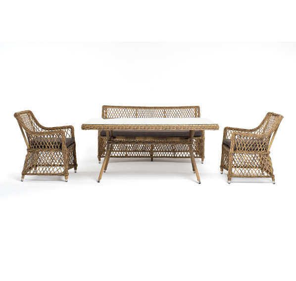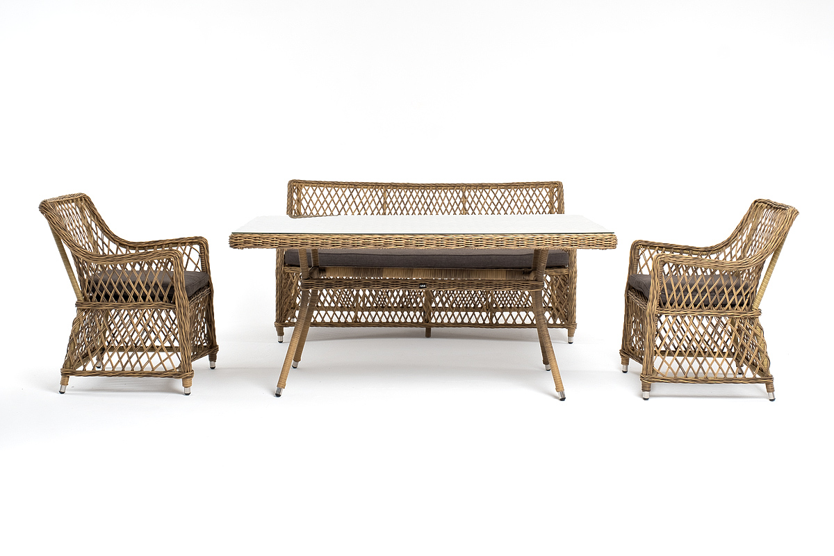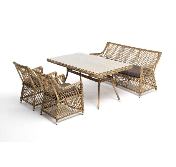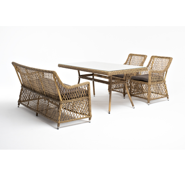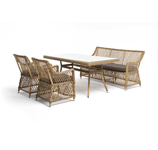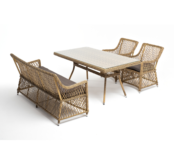 Все предметы мебели изготовлены из прочного алюминия, вручную оплетенного долговечным искусственным ротангом. На креслах и диване предусмотрены подушки со съёмными чехлами и влагостойкой пропиткой. Стол укомплектован прочным стеклом толщиной 5 мм для удобства использования.