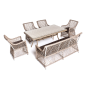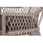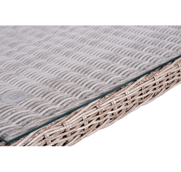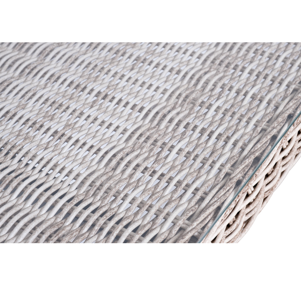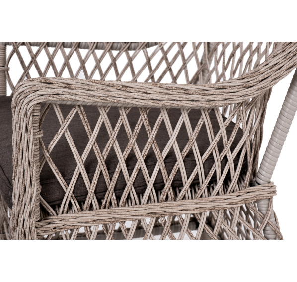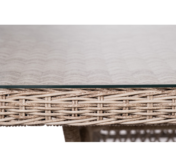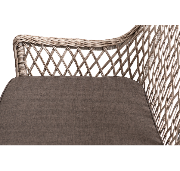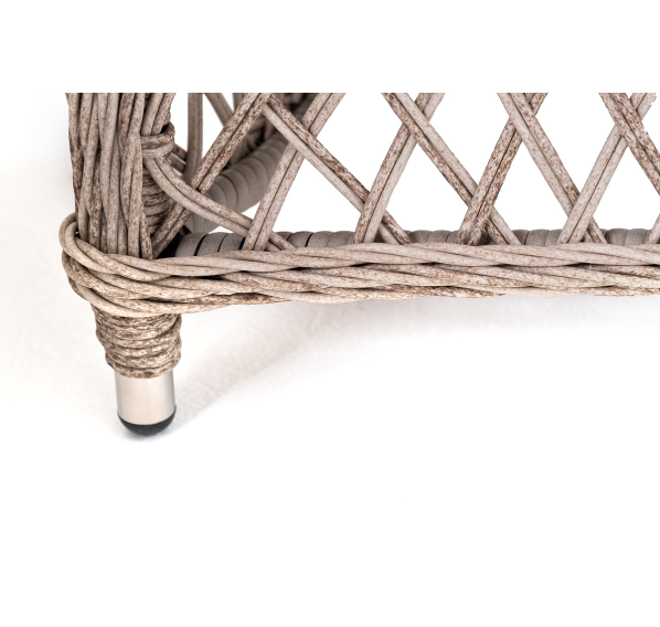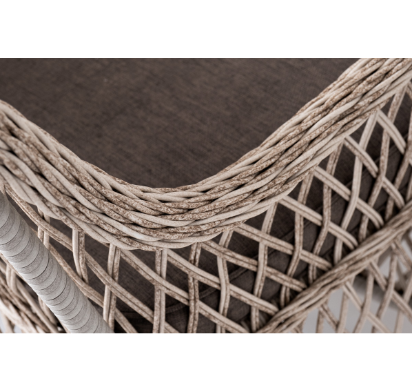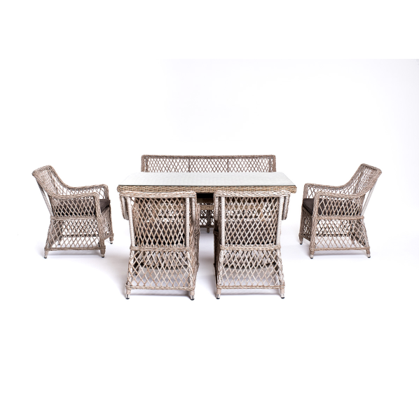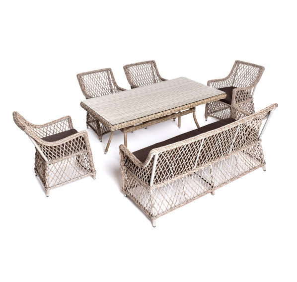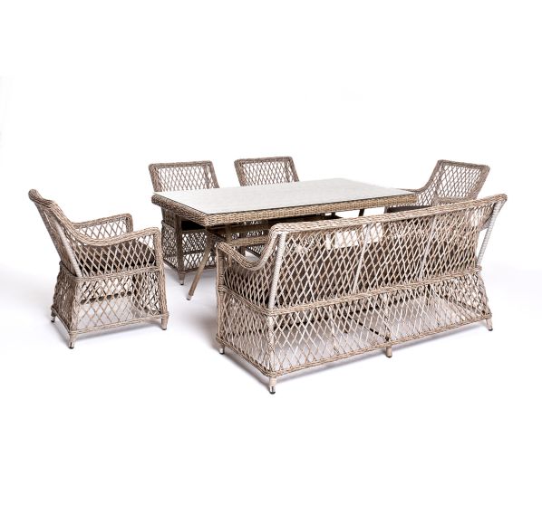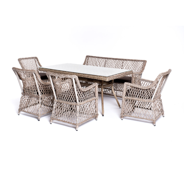 Все предметы мебели изготовлены из прочного алюминия, вручную оплетенного долговечным искусственным ротангом. На креслах и диване предусмотрены подушки со съёмными чехлами и влагостойкой пропиткой. Стол укомплектован прочным стеклом толщиной 5 мм для удобства использования.