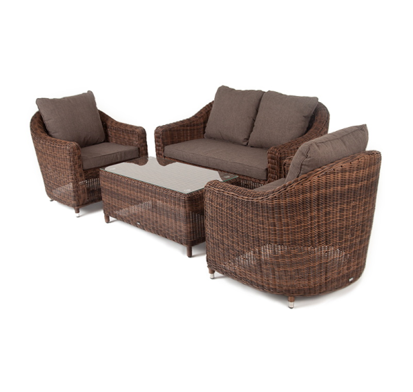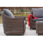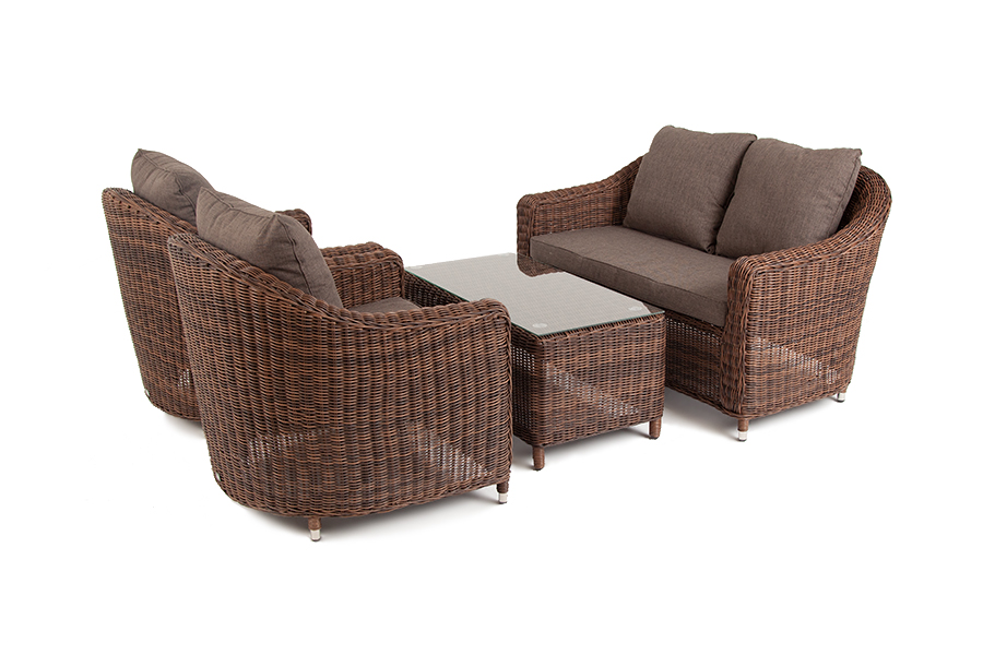 Садовая мебель выполнена из алюминиевого каркаса, выдерживающего большие нагрузки, и круглого искусственного ротанга. Каркас оплетен с помощью ручного метода и представлен в коричневом цвете.