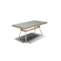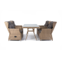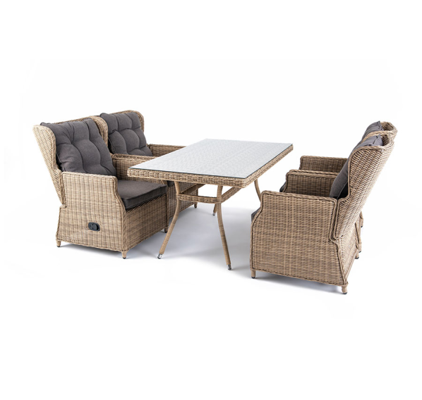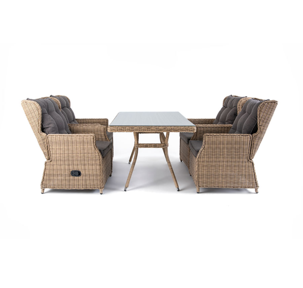 Обеденная группа из искусственного ротанга: 4 раскладывающихся кресла и обеденный стол со стеклянной столешницей.