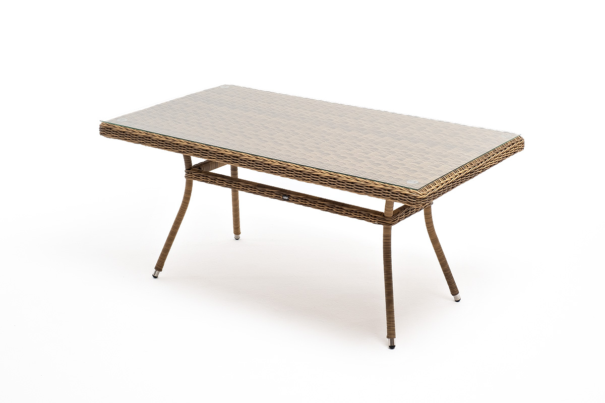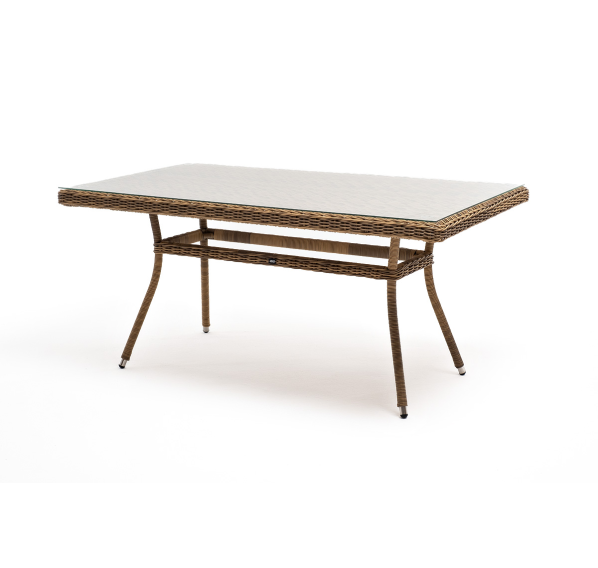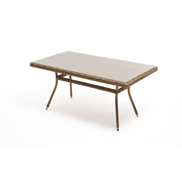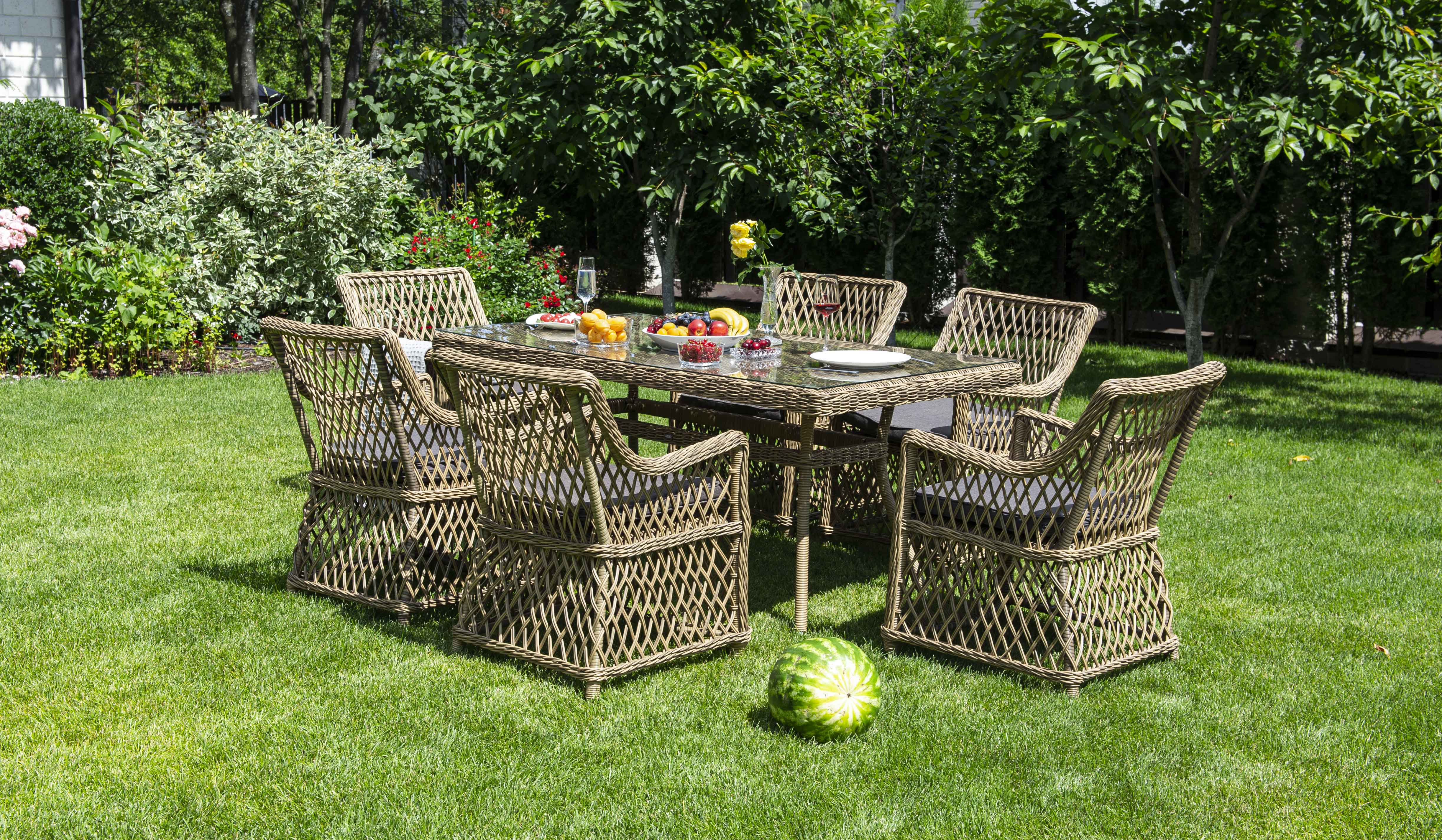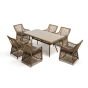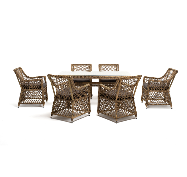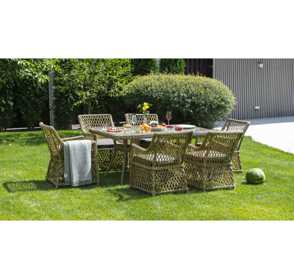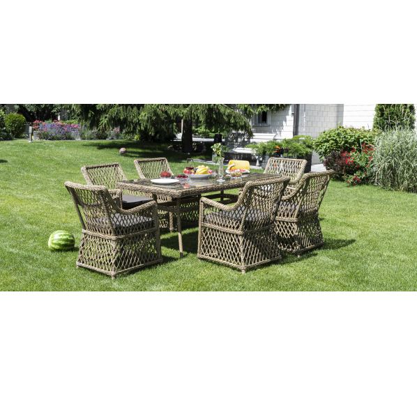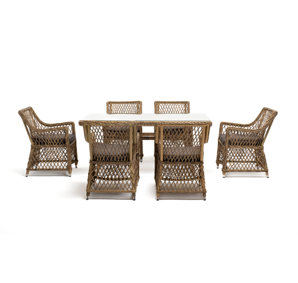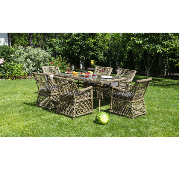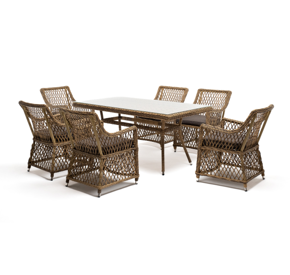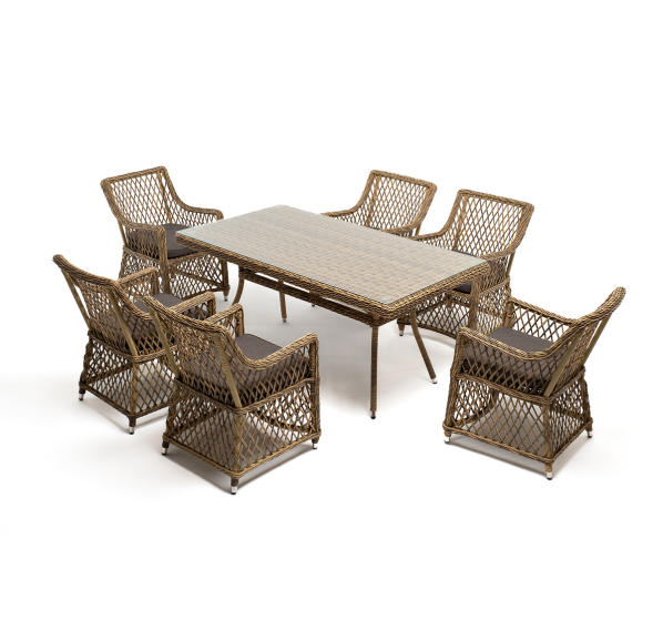 Элитная обеденная группа «Латте» для обустройства зоны отдыха на открытом пространстве. В комплекте прямоугольный обеденный стол 1600×900×750 мм и 6 кресел 550×660×850 мм.