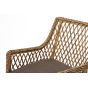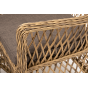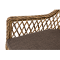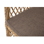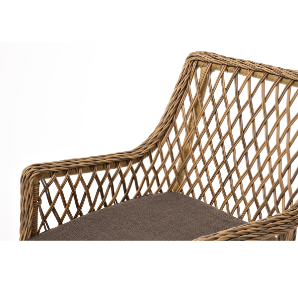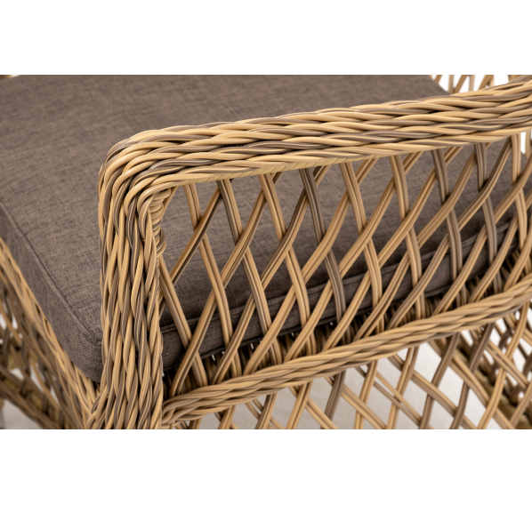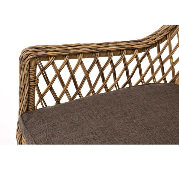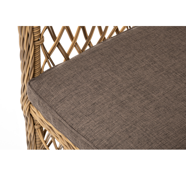 Каркас мебели изготовлен из прочного алюминия и задекорирован синтетическим искусственным ротангом натурального соломенного оттенка. Материал устойчив к ультрафиолетовому излучению. Кресла оснащены мягкими подушками со съёмными чехлами.