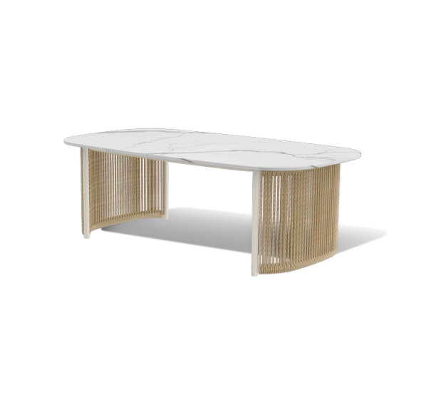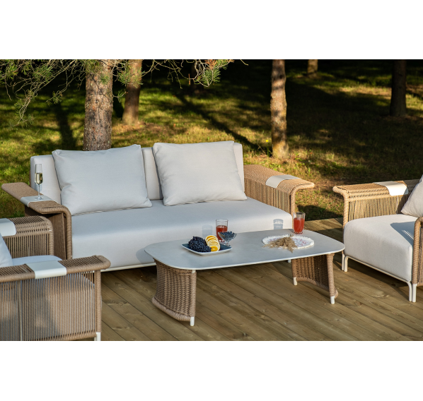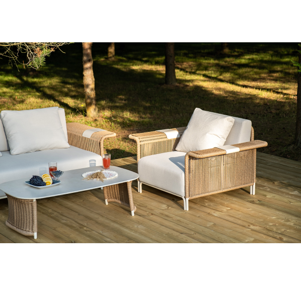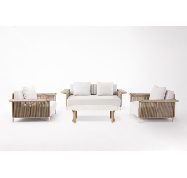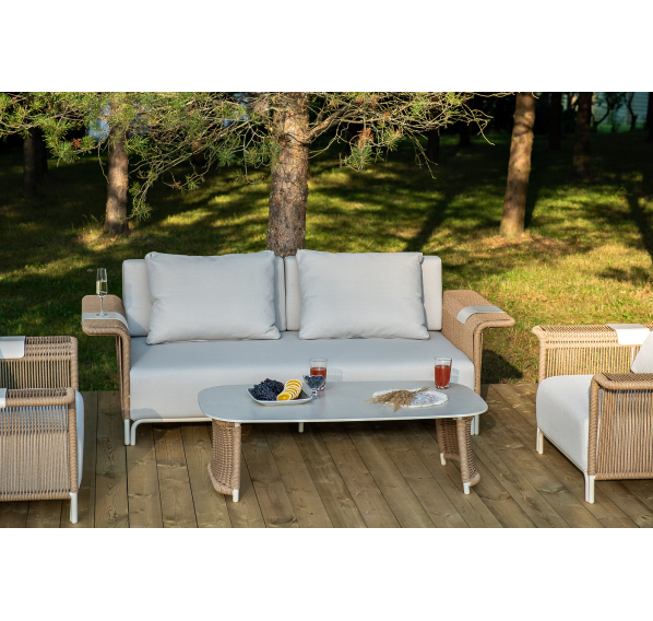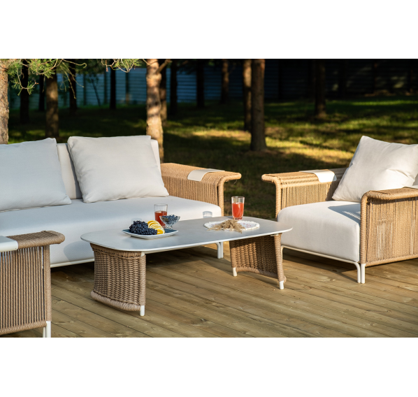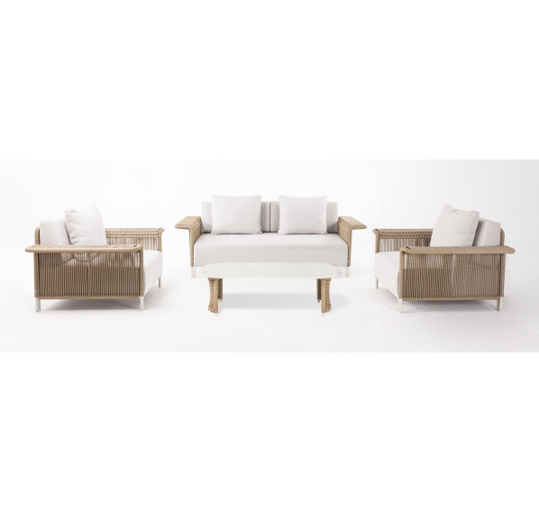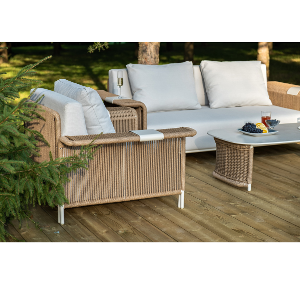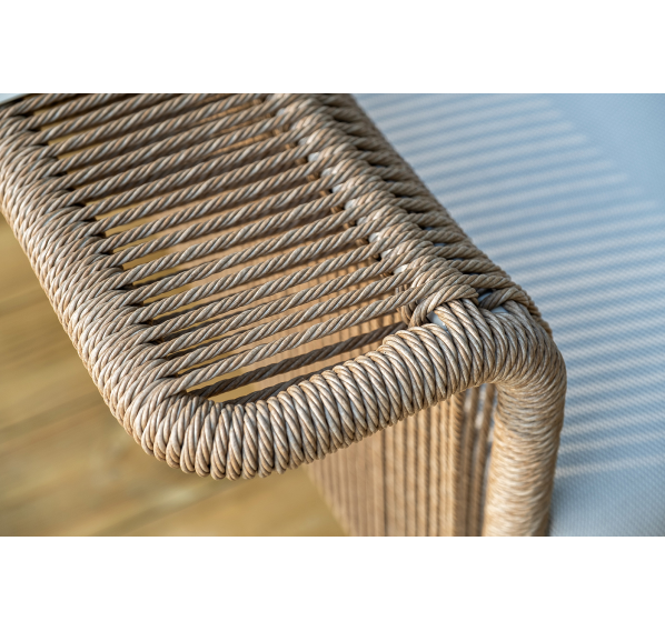 Комплект выполнен из алюминиевого каркаса, окрашенного порошковой износостойкой краской. Оттенок - «слоновая кость». Искусственный ротанг соломенного цвета украшает мебель в качестве круглого ручного плетения - 7 мм.