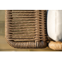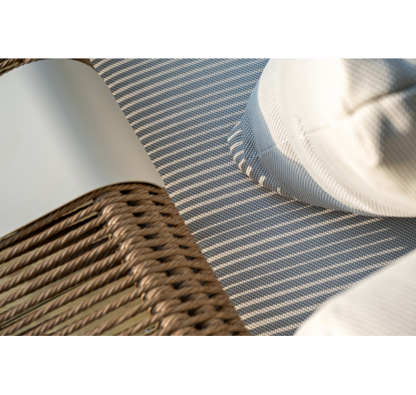 Укомплектовано плетеное кресло удобными мягкими подушками, одна из которых располагается в области спинки. Они выполнены в бежевом оттенке. При пошиве тканевых изделий используется 100% полиэстер, плотностью 300гр/м2. Он в обязательном порядке проходит обработку влагоотталкивающей пропиткой.