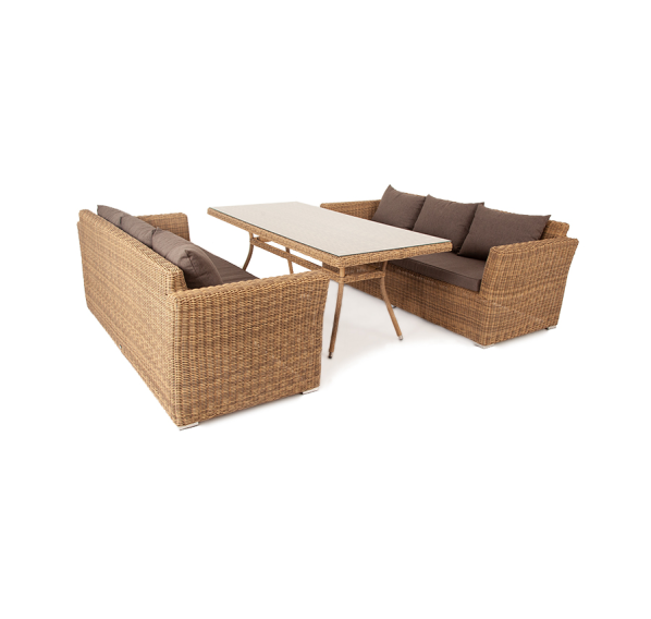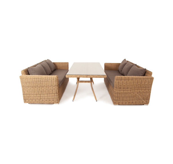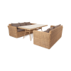 Лаконичная обеденная группа премиум-класса «Мокко Дабл» из искусственного ротанга ручного плетения натурального соломенного оттенка.